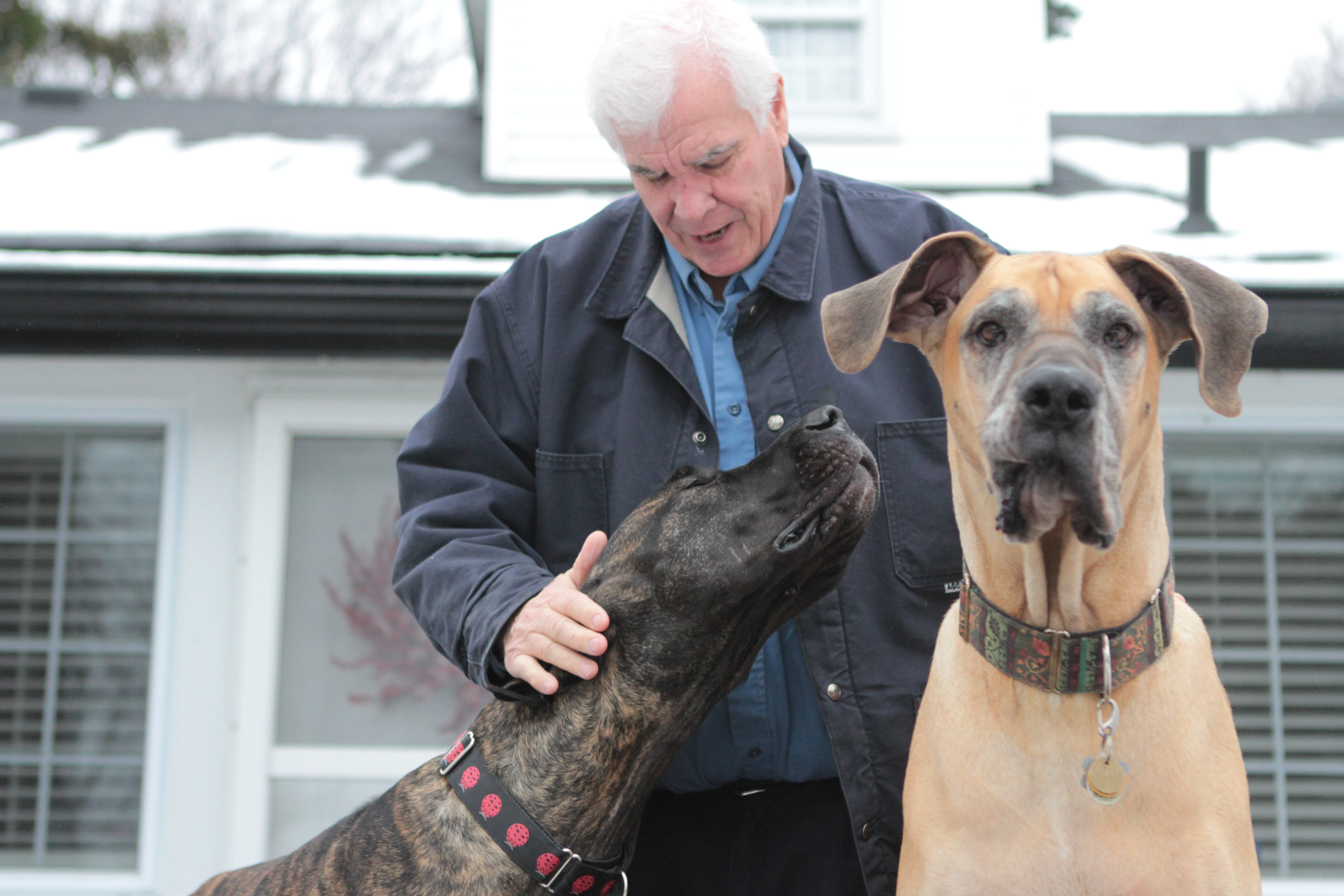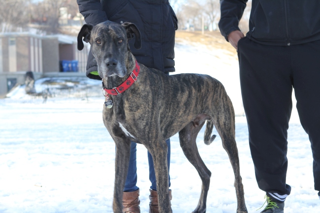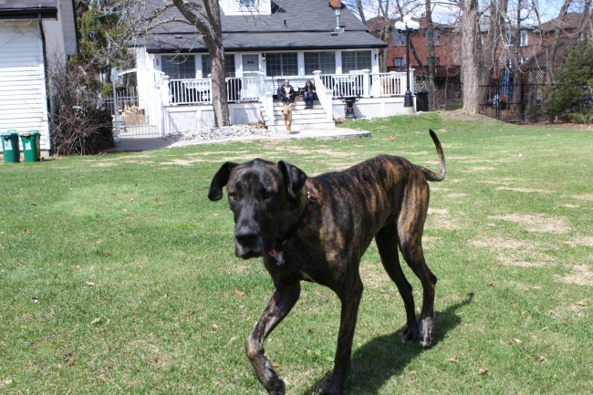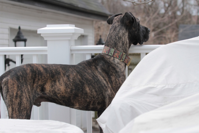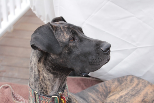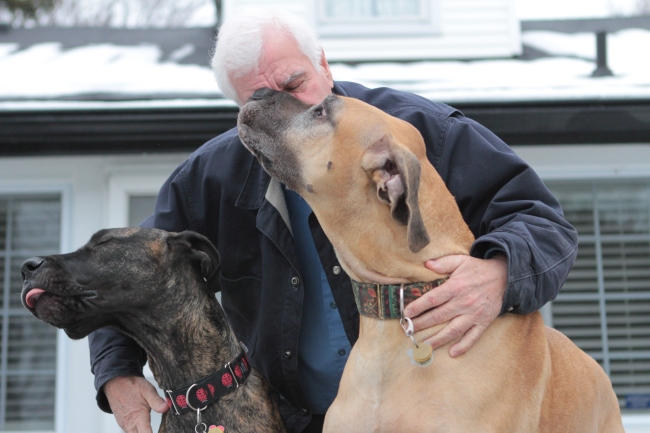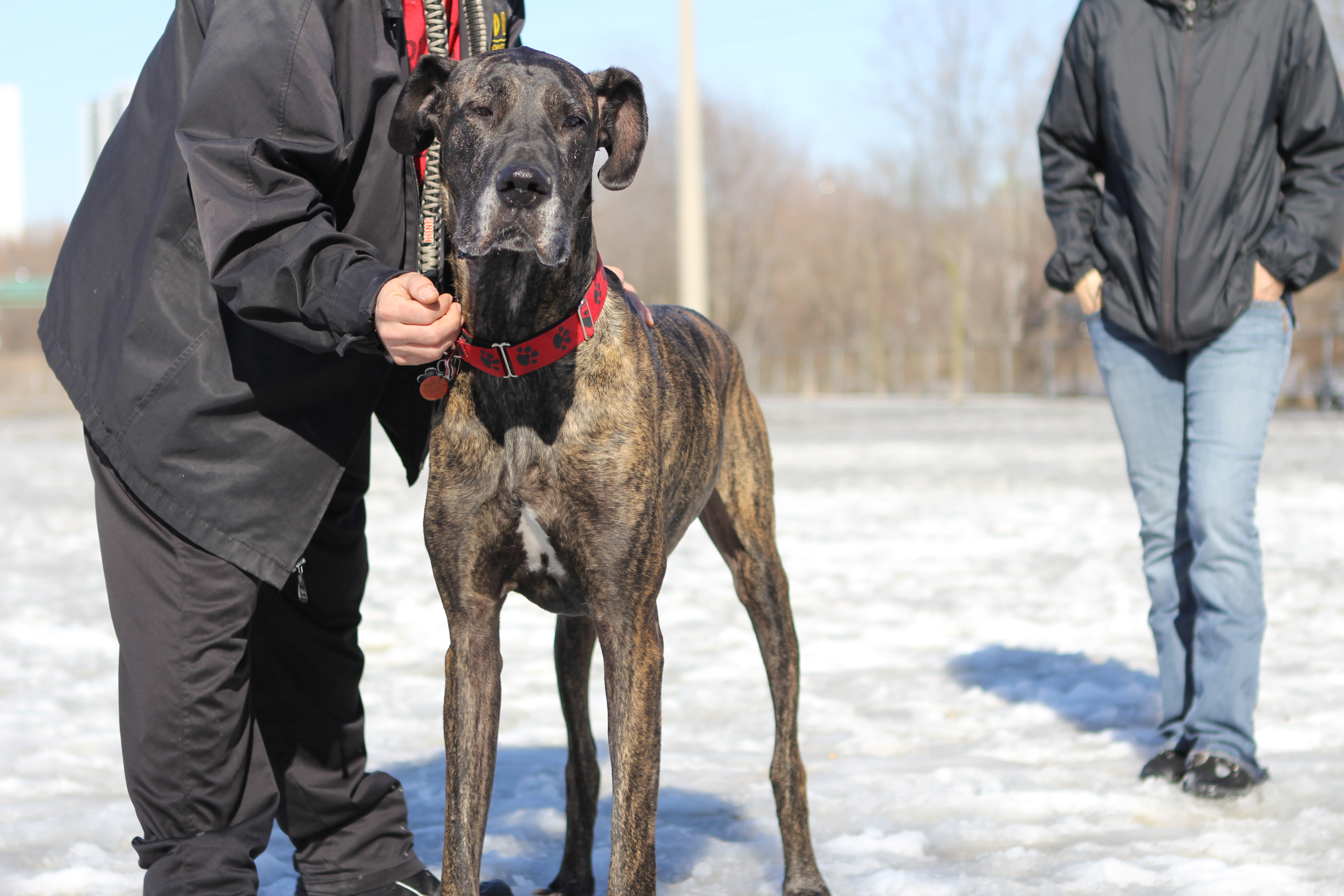 Guinness. We first heard about Guinness through GDRI due to an absolute travesty of a household. Guinness was one of four Great Danes living in a home with an abusive husband, a wife, and several children. The dogs were beaten, abused and starved. After the husband left, the family abandoned the Great Danes in the basement because they were upside-down on the mortgage. When a friend of the wife learned about this a month after the abandonment, she immediately went to house, broke in to rescue the 4, took them home and called GDRI for help. After time in the vet’s ICU, the four Danes (aged 1.5 and 3) went to four separate fosters, with Guinness going to Ontario.