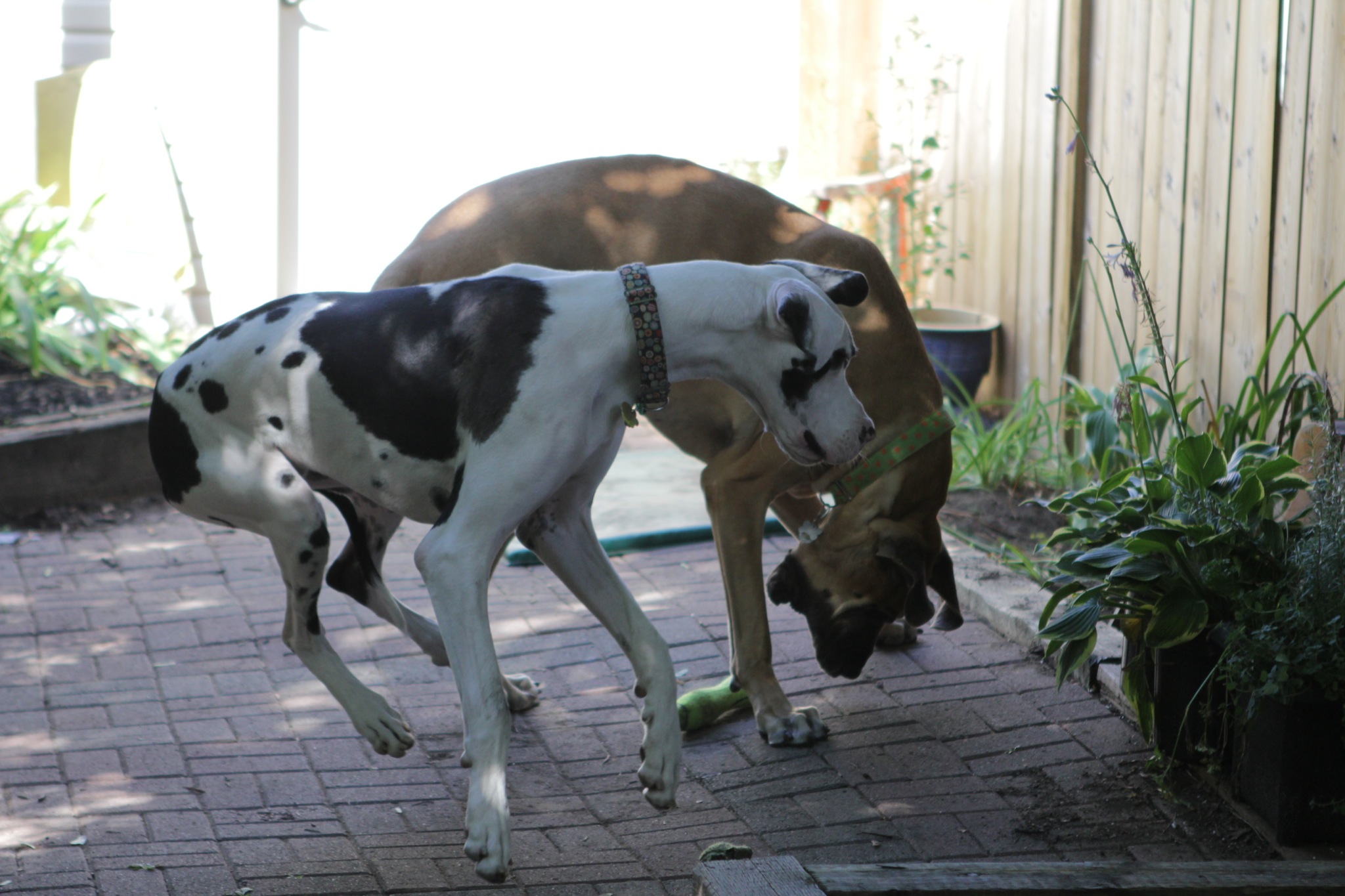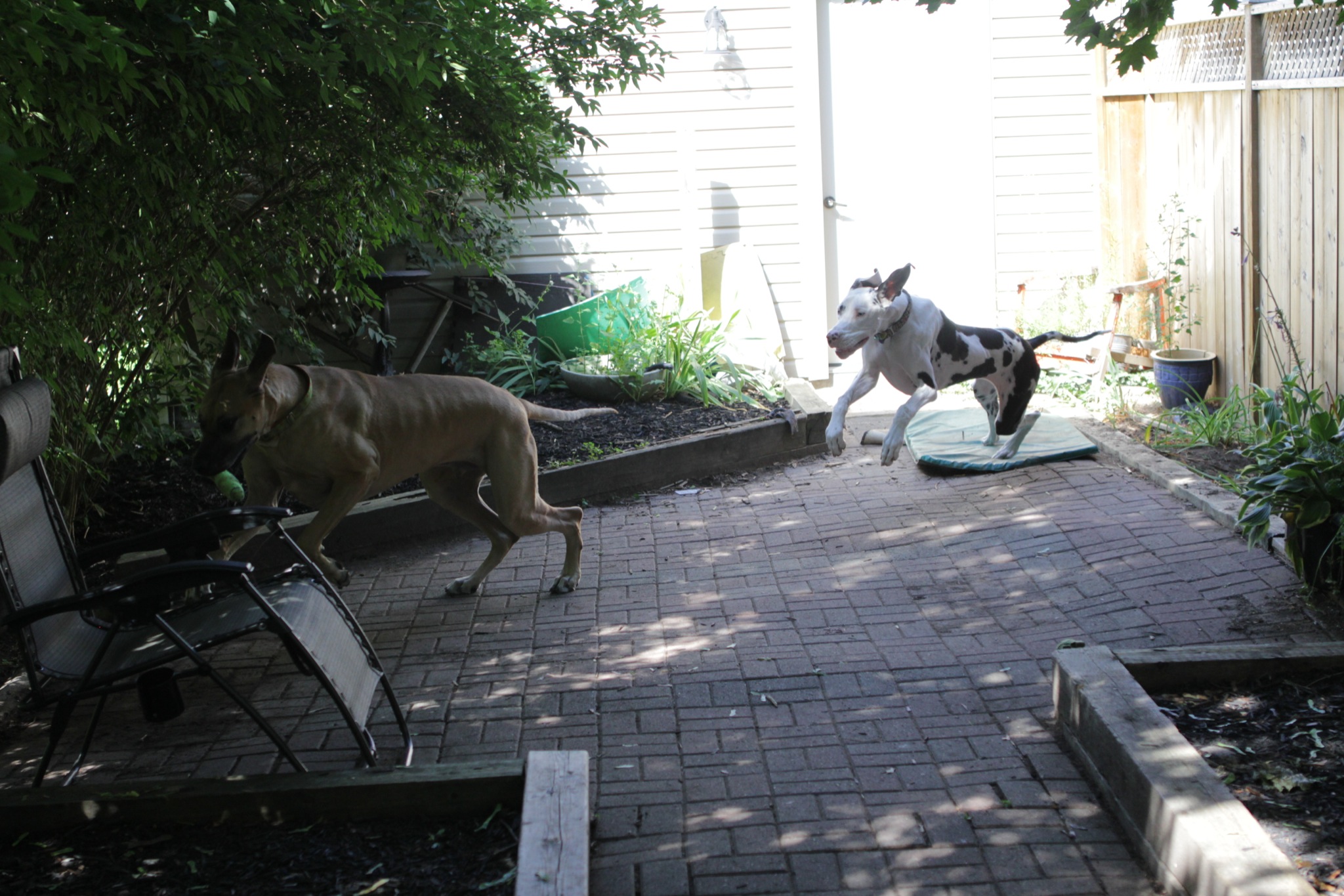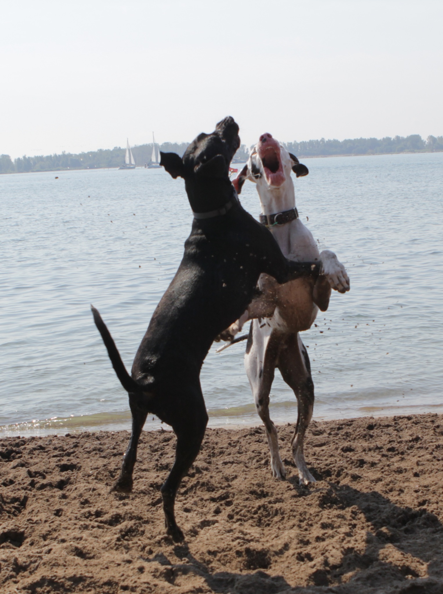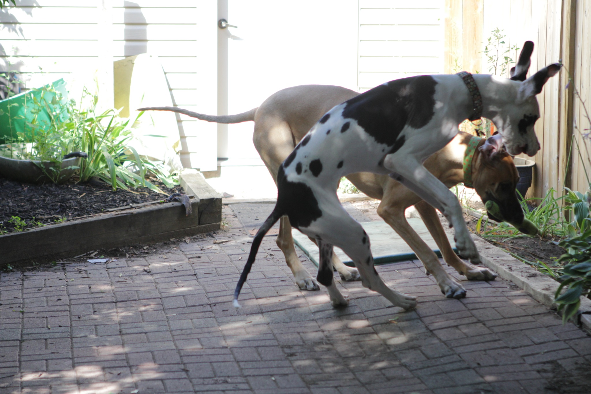 One of the first things that Sarah did was to bring Polka to our local off-leash park. We know a dog-walker there who used to be a judge at dog conformation shows. Toronto Animal Services had estimated that Polka was approximately eight months old, but the former judge suggested that he was closer to ten months. So from that point forward, we went with his birth being in June 2012. Polka had a lot of energy, and was eager to have other dogs to play with. Not all dogs were happy with him, but most owners seem sympathetic to our situation. Most important was that Danforth and he played together every day, in the house or in the backyard. It was a pleasure to see it in action.