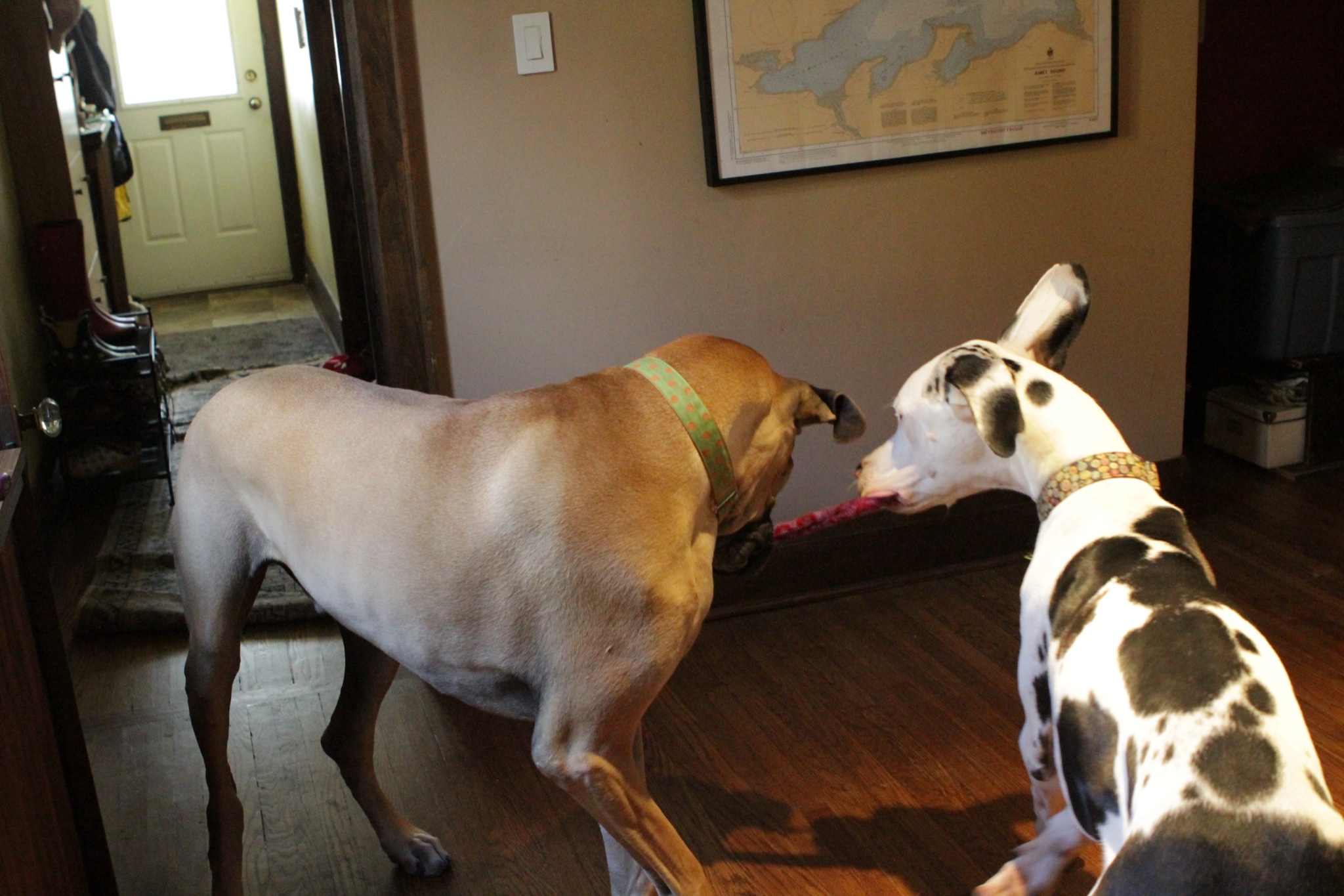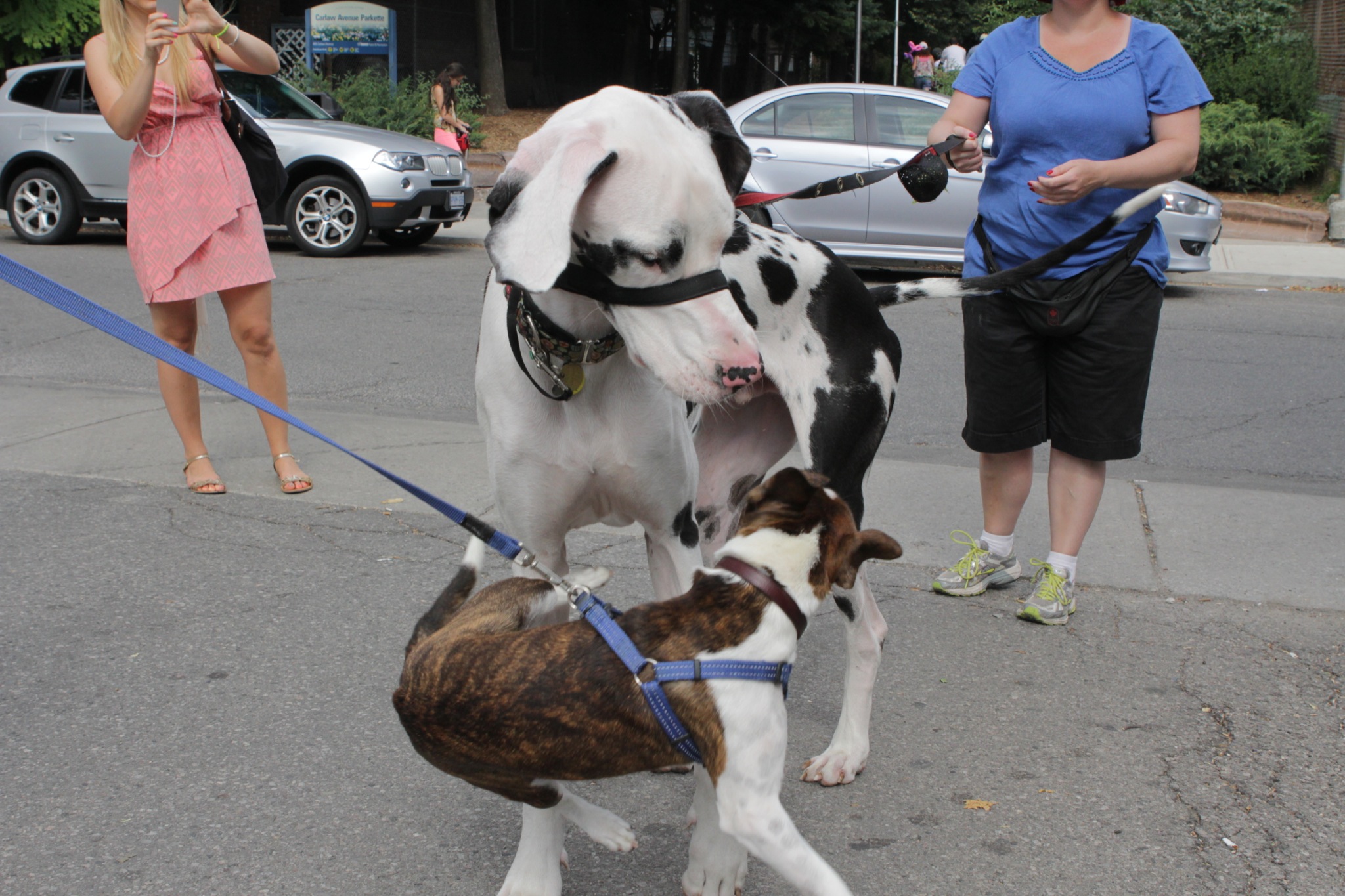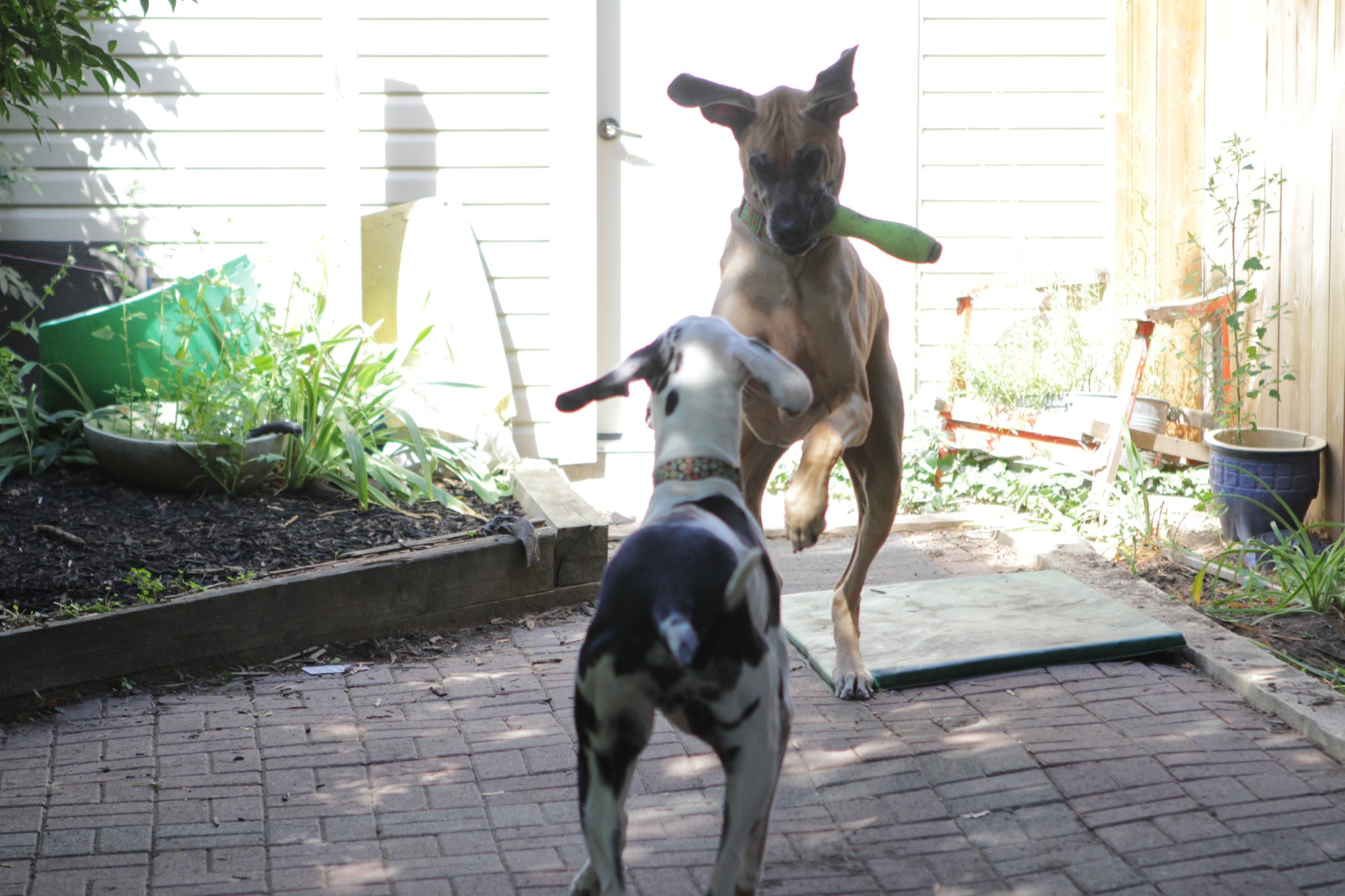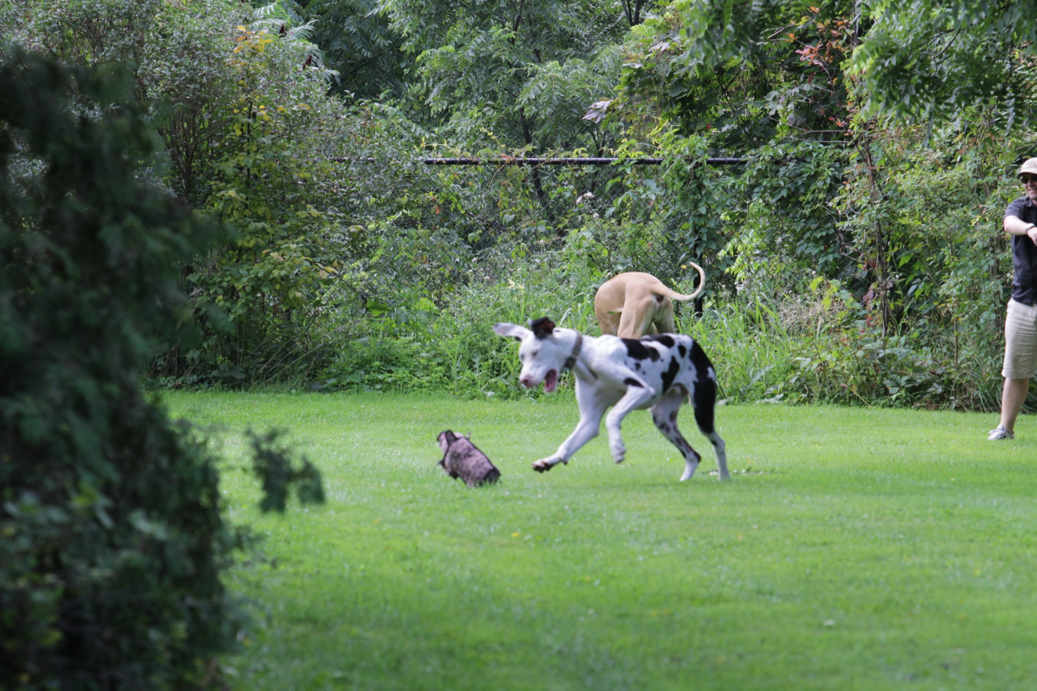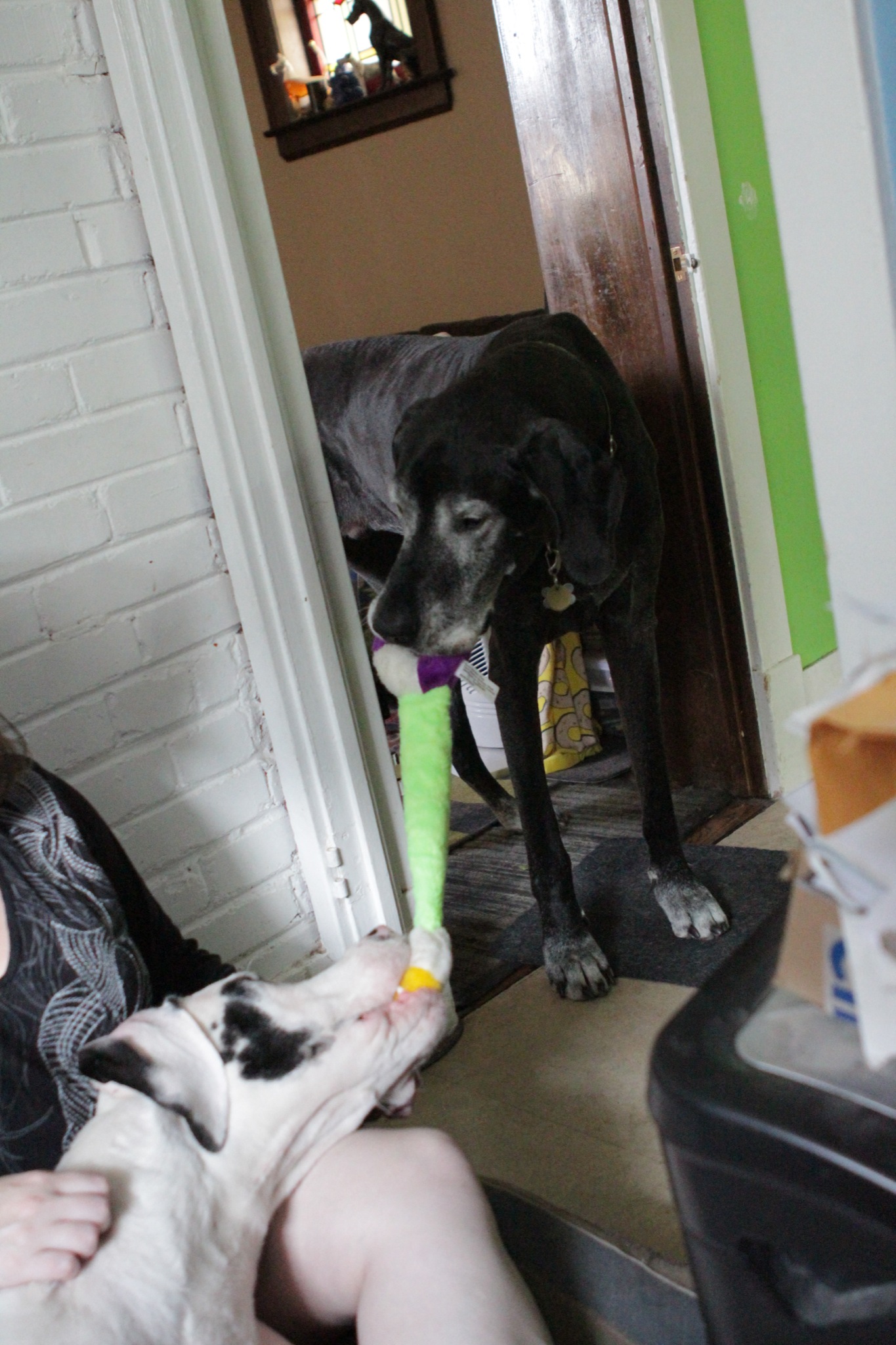 One of the first things that Sarah did was to bring Polka to our local off-leash park. We know a dog-walker there who used to be a judge at dog conformation shows. Toronto Animal Services had estimated that Polka was approximately eight months old, but the former judge suggested that he was closer to ten months. So from that point forward, we went with his birth being in June 2012. Polka had a lot of energy, and was eager to have other dogs to play with. Not all dogs were happy with him, but most owners seem sympathetic to our situation. Most important was that Danforth and he played together every day, in the house or in the backyard. It was a pleasure to see it in action.