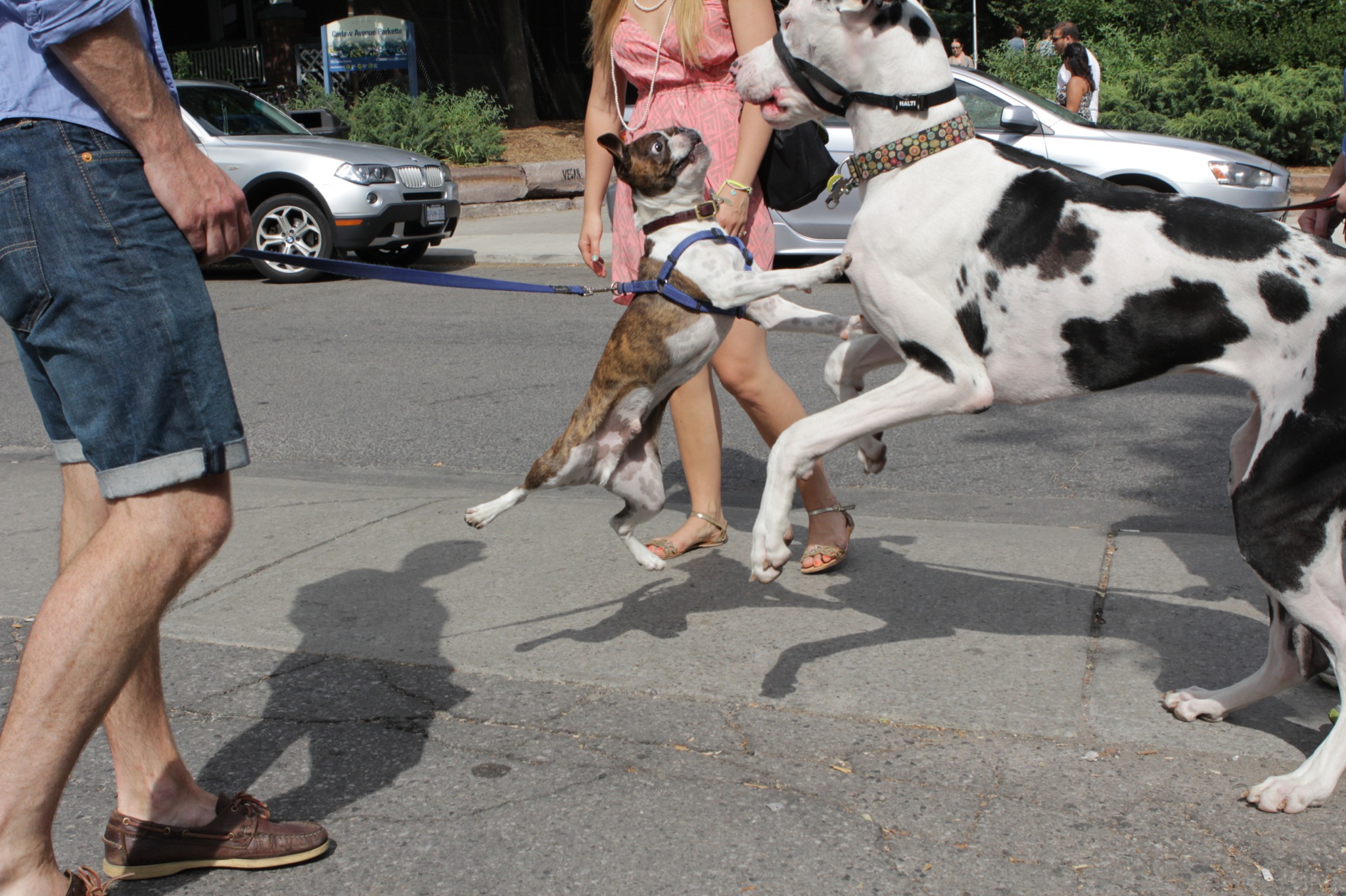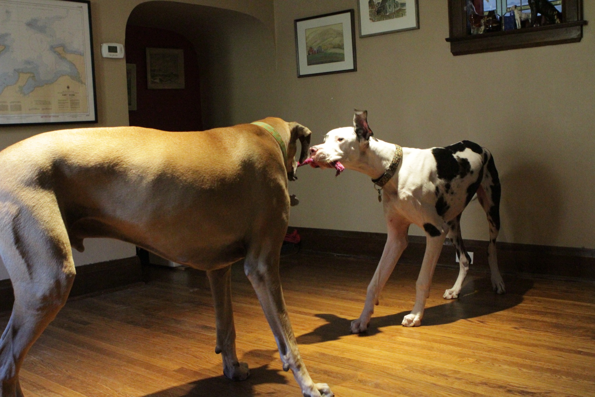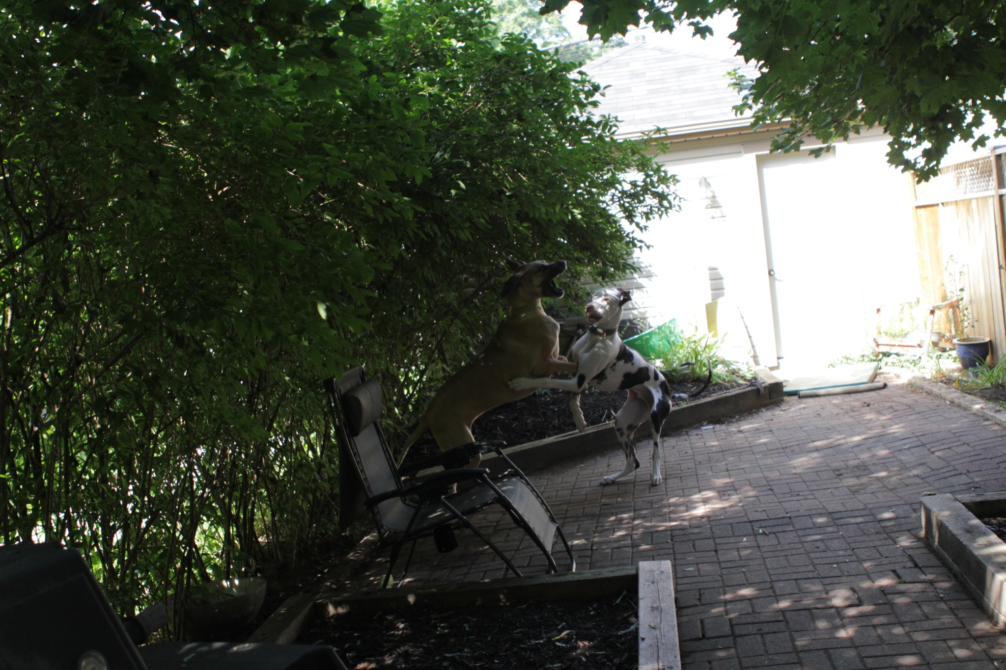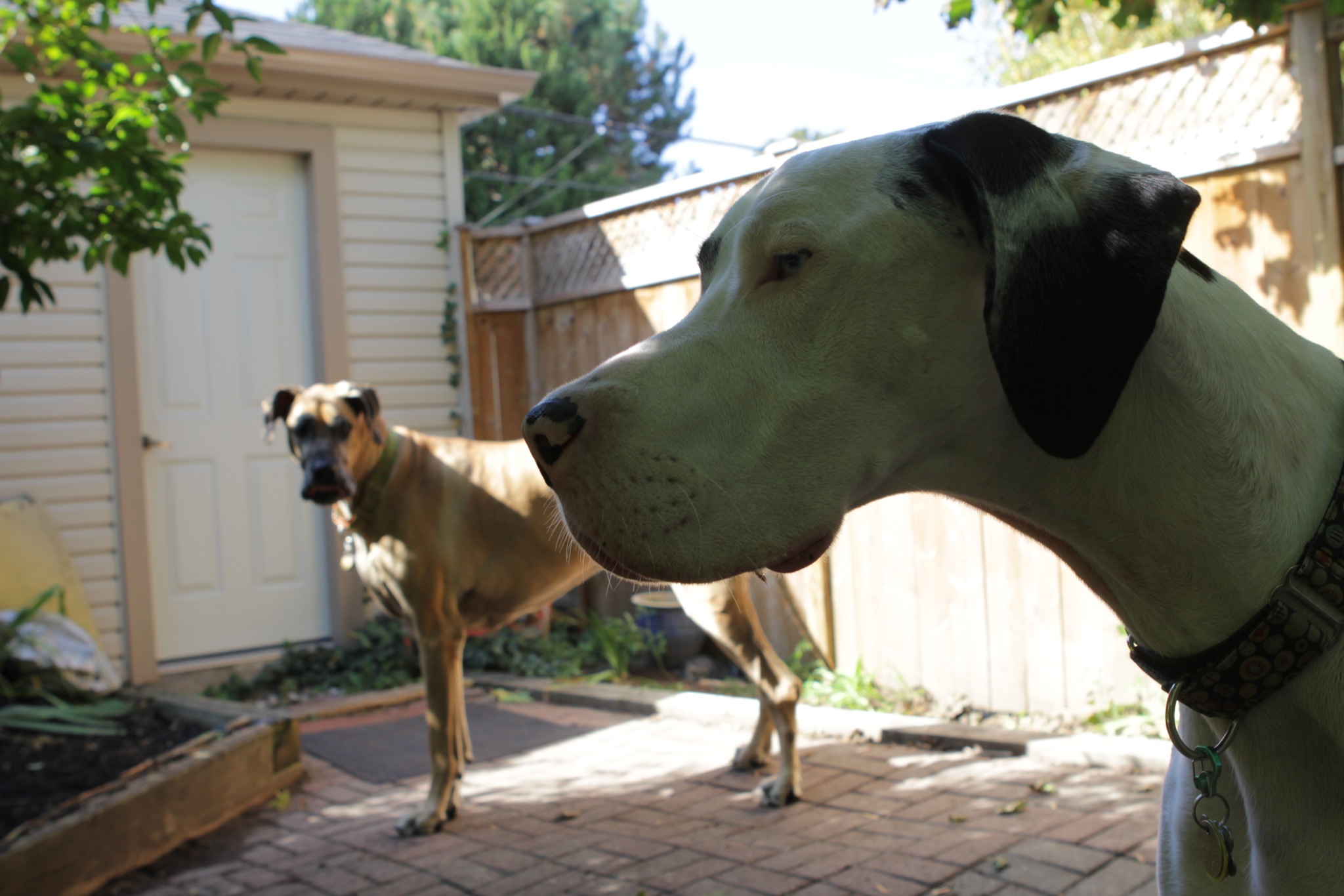 One of the first things that Sarah did was to bring Polka to our local off-leash park. We know a dog-walker there who used to be a judge at dog conformation shows. Toronto Animal Services had estimated that Polka was approximately eight months old, but the former judge suggested that he was closer to ten months. So from that point forward, we went with his birth being in June 2012. Polka had a lot of energy, and was eager to have other dogs to play with. Not all dogs were happy with him, but most owners seem sympathetic to our situation. Most important was that Danforth and he played together every day, in the house or in the backyard. It was a pleasure to see it in action.