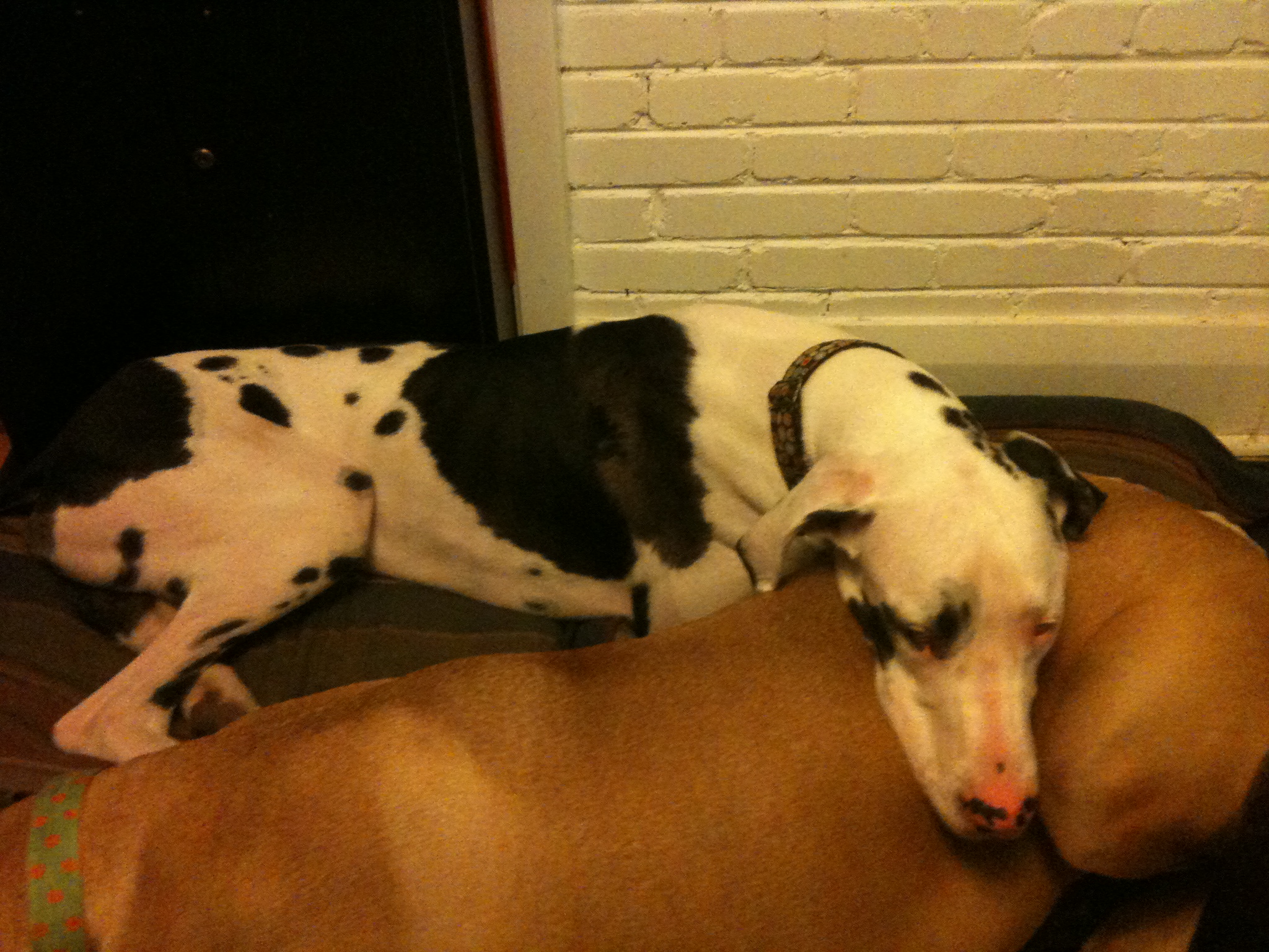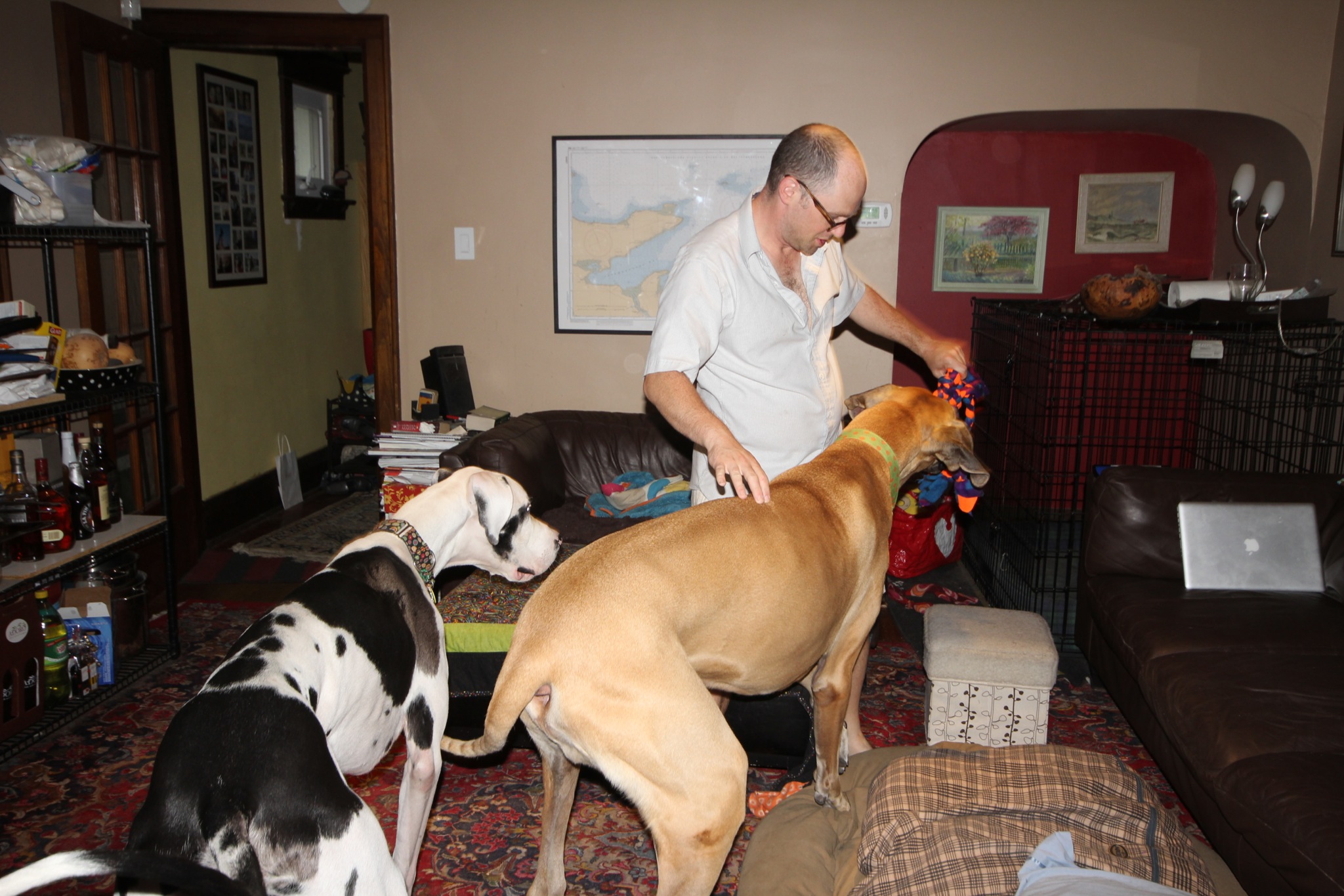 In spite of my frustration, he was a wonderful dog. His affection knew no limit. He always wanted to be close to those he felt were his. I think that that's reflected in many of the pictures below. There is a tremendous loss in our house. He was not lucky enough to reach 18 months. We are not lucky enough to have had years and years to share with him. His was a wonderful energy in our house, which now feels incredibly empty without it. Polka's life came to a sudden end on Monday, October 14th, 2013. The autopsy wasn't definitive, beyond what I would characterize as a heart attack. The loss of daily play appears to have left Danforth a little lost. Needless to say, but Sarah and I are heartbroken. Making this page has been very emotional. We try to comfort ourselves knowing that we tried to give him a safe and loving home for the time he was with us. He played with Danforth right up until the very end. And because of that, we want to believe that he knew joy.