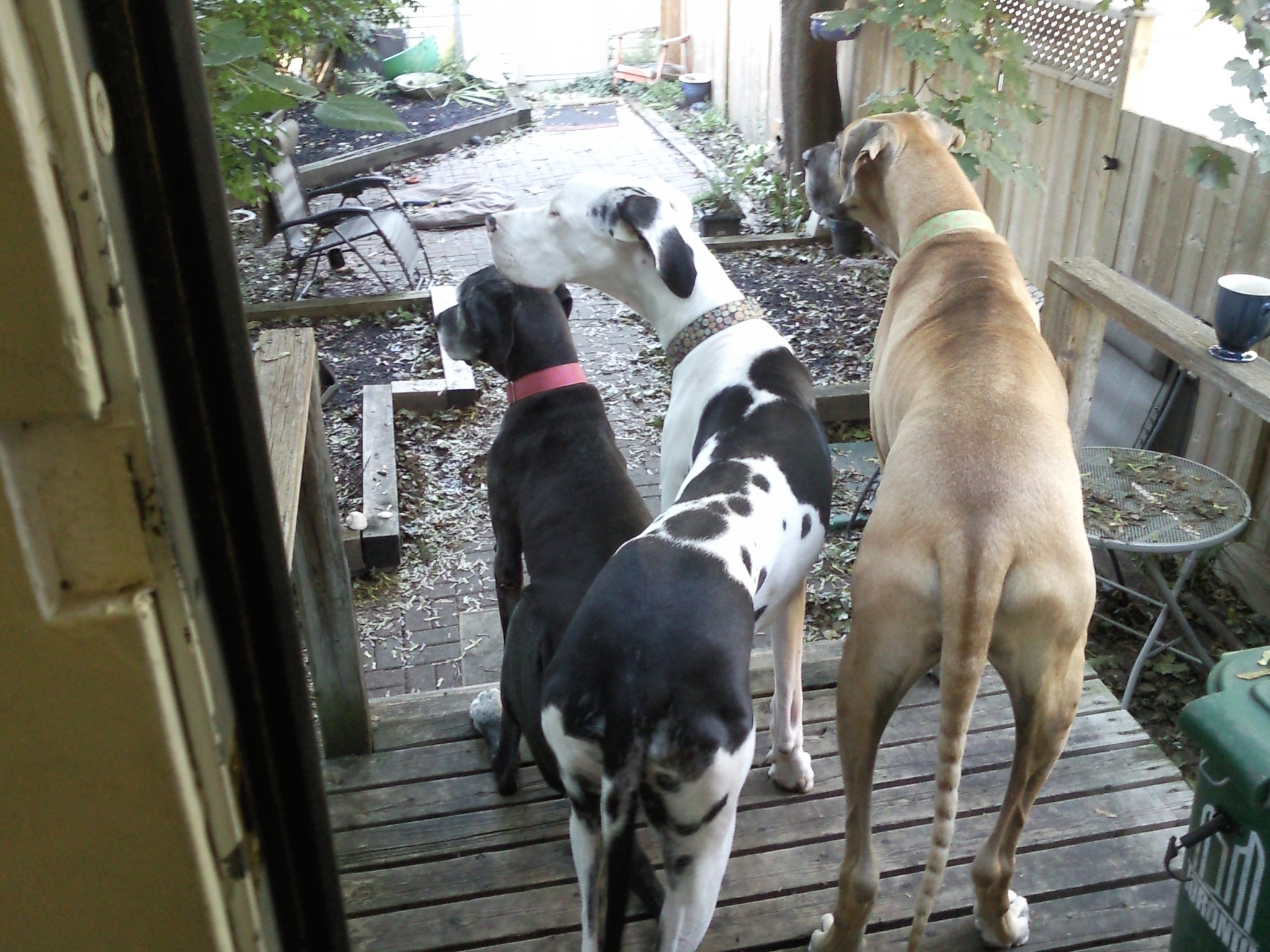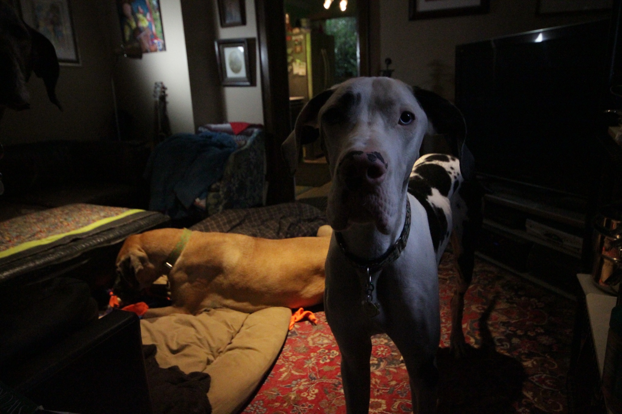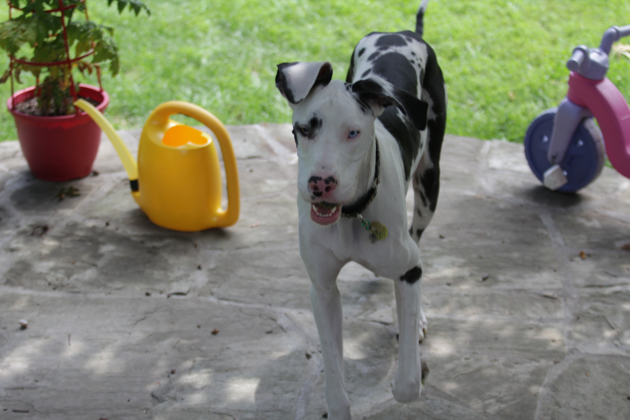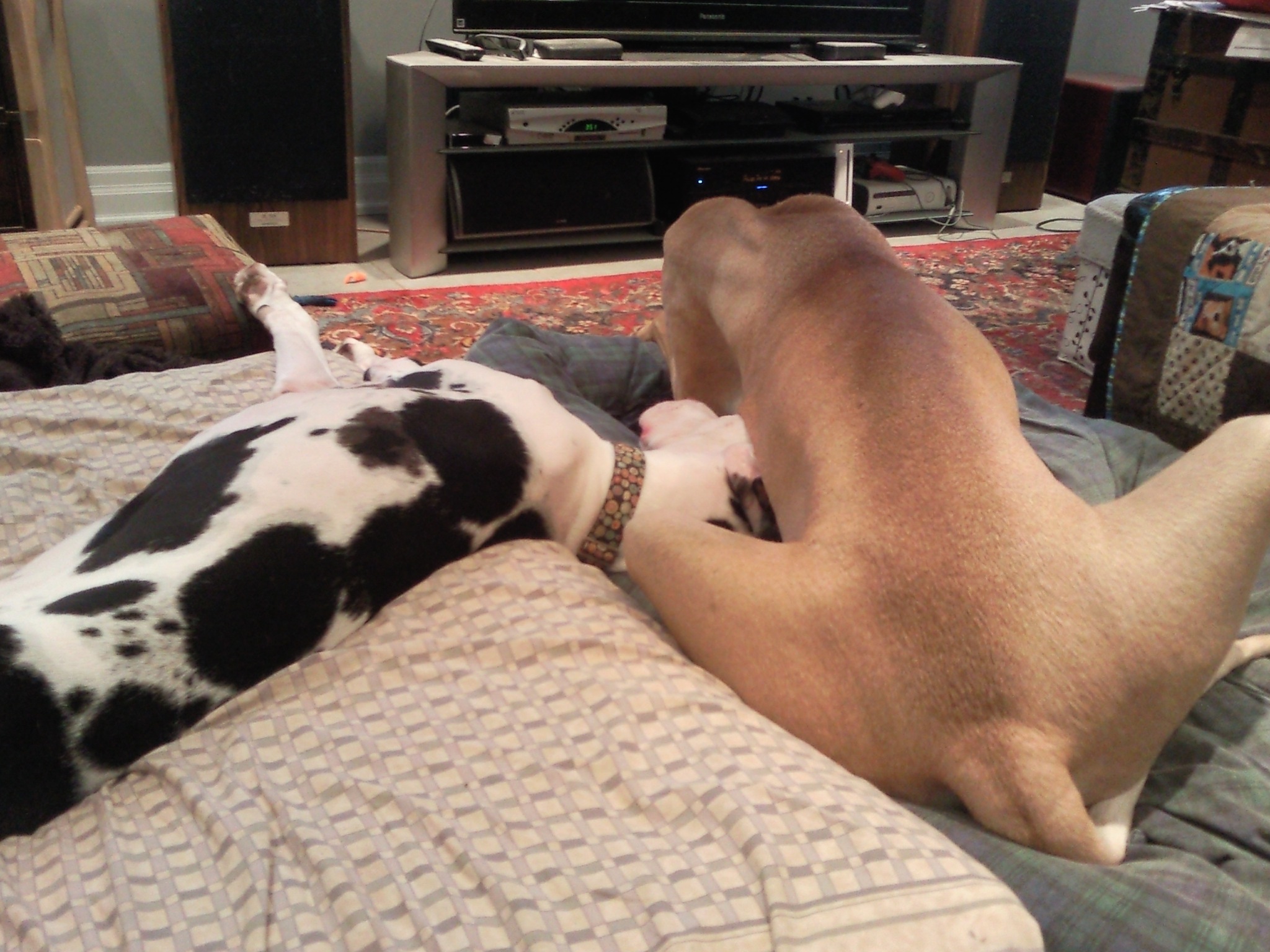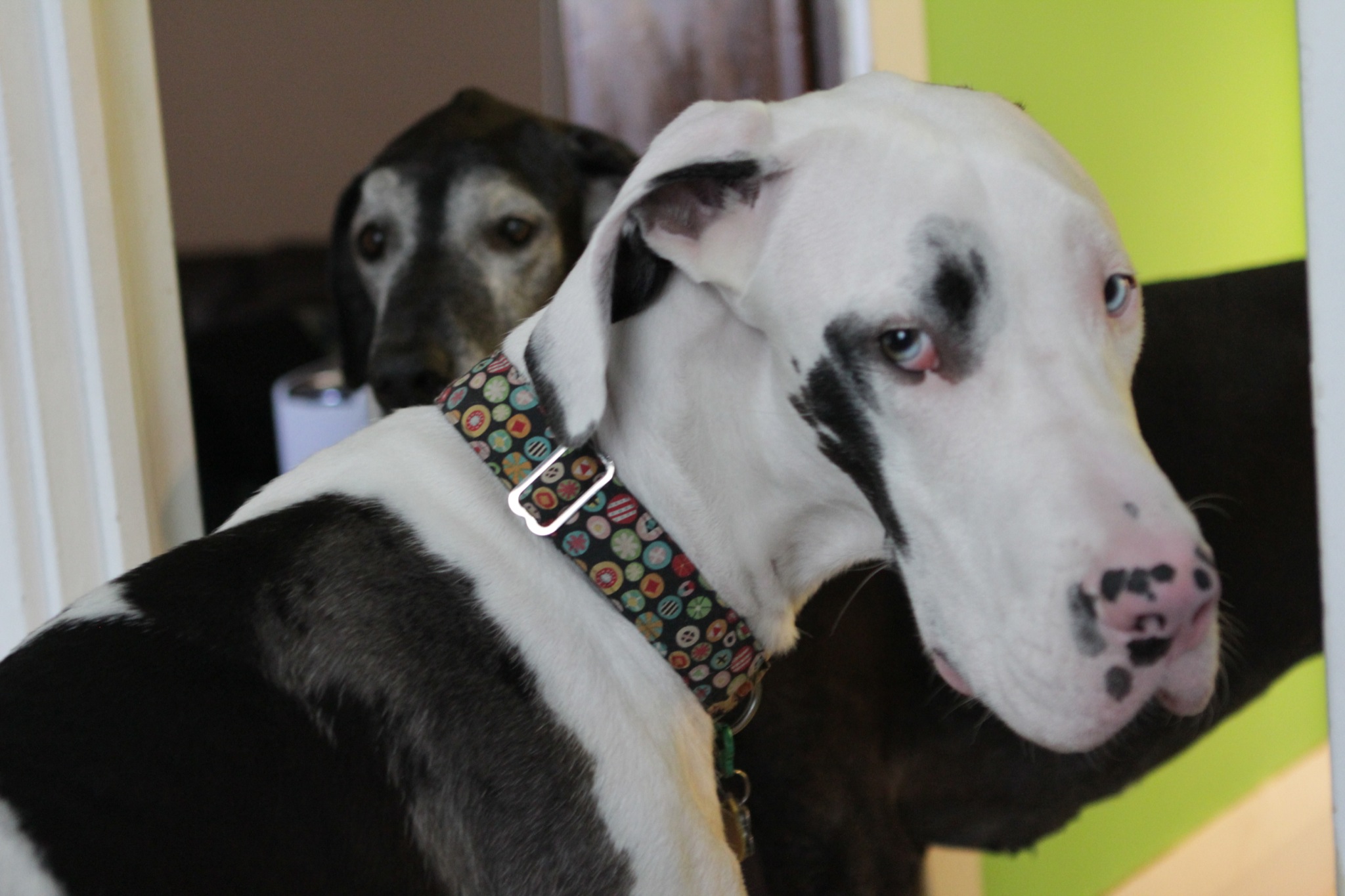 Polka. We were first told about Polka on Sunday March 3rd, 2013. A friend of ours who knows that we are very involved in Toronto's Great Dane community, as well as with Great Dane Rescue, told us that Toronto Animal Services was going to have a young Great Dane made available the next day. He was letting Sarah & I know, in case we knew of anyone that was actively looking at adopting a young Dane. I showed Sarah a picture of him, and she told me that she loved him. Well, we took Danforth down to meet the unnamed Dane the next day, and saw that the two got along. That pretty much sealed it. Sarah filled out forms to "reserve" him, and although we had other things to do that day, we quickly arranged to get our crate back, as it was on loan to another Dane household. The next day, March 5th, Sarah went with our Dane friend, Stacie, and they picked Polka up, and brought him home. We had tried to decide on the name, and it was essentially my turn, but I gave Sarah a couple of choices. She ended up intially registering him as "Panda", but couldn't stick to that, she preferred my first choice, "Polka". I was very happy with the name.