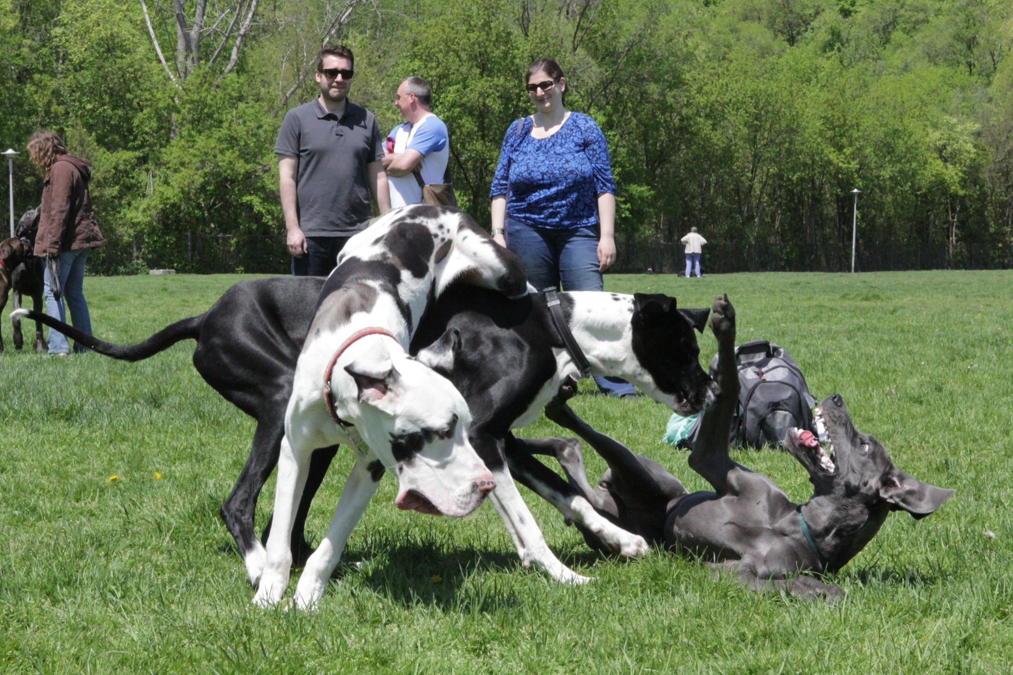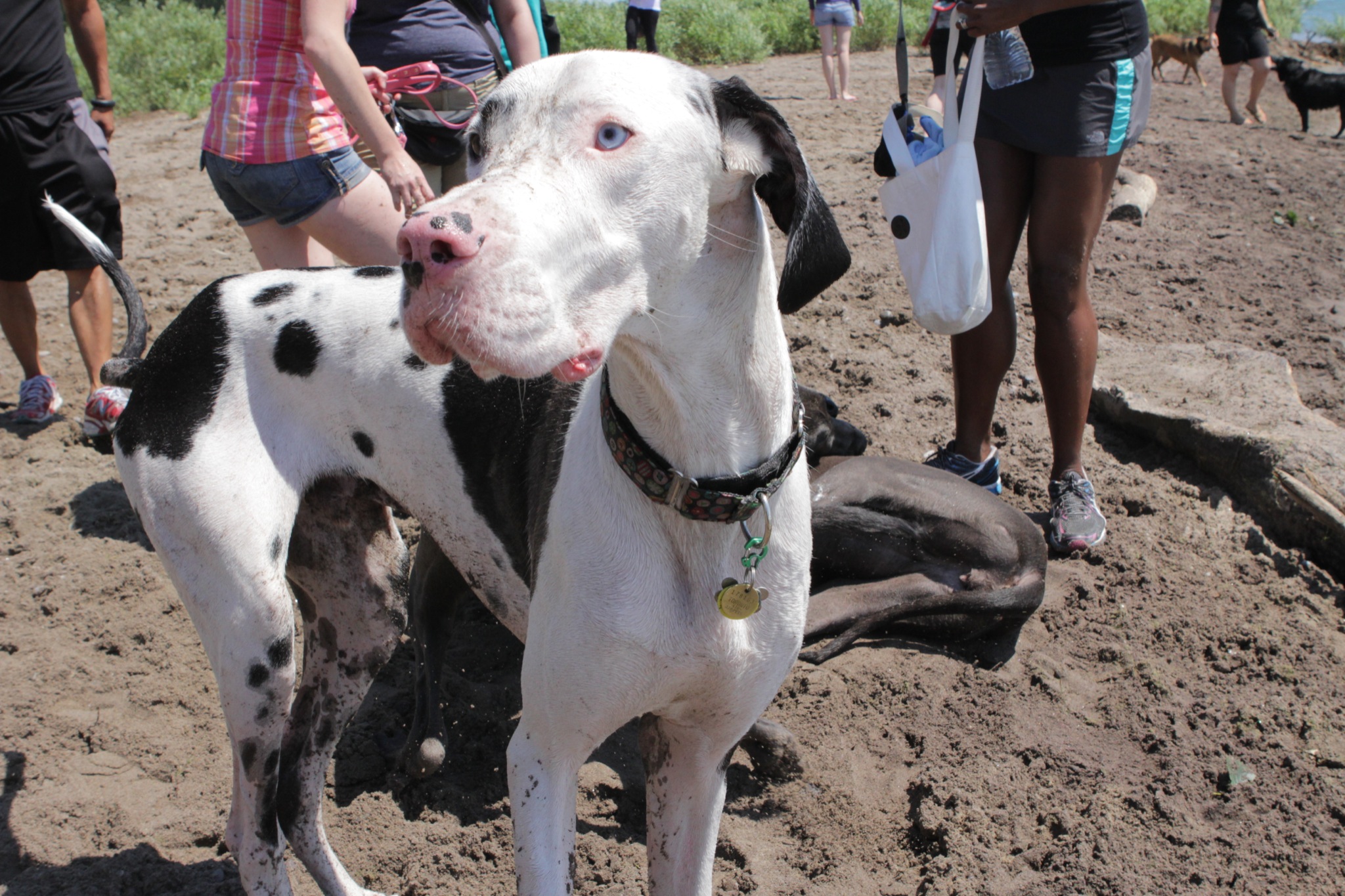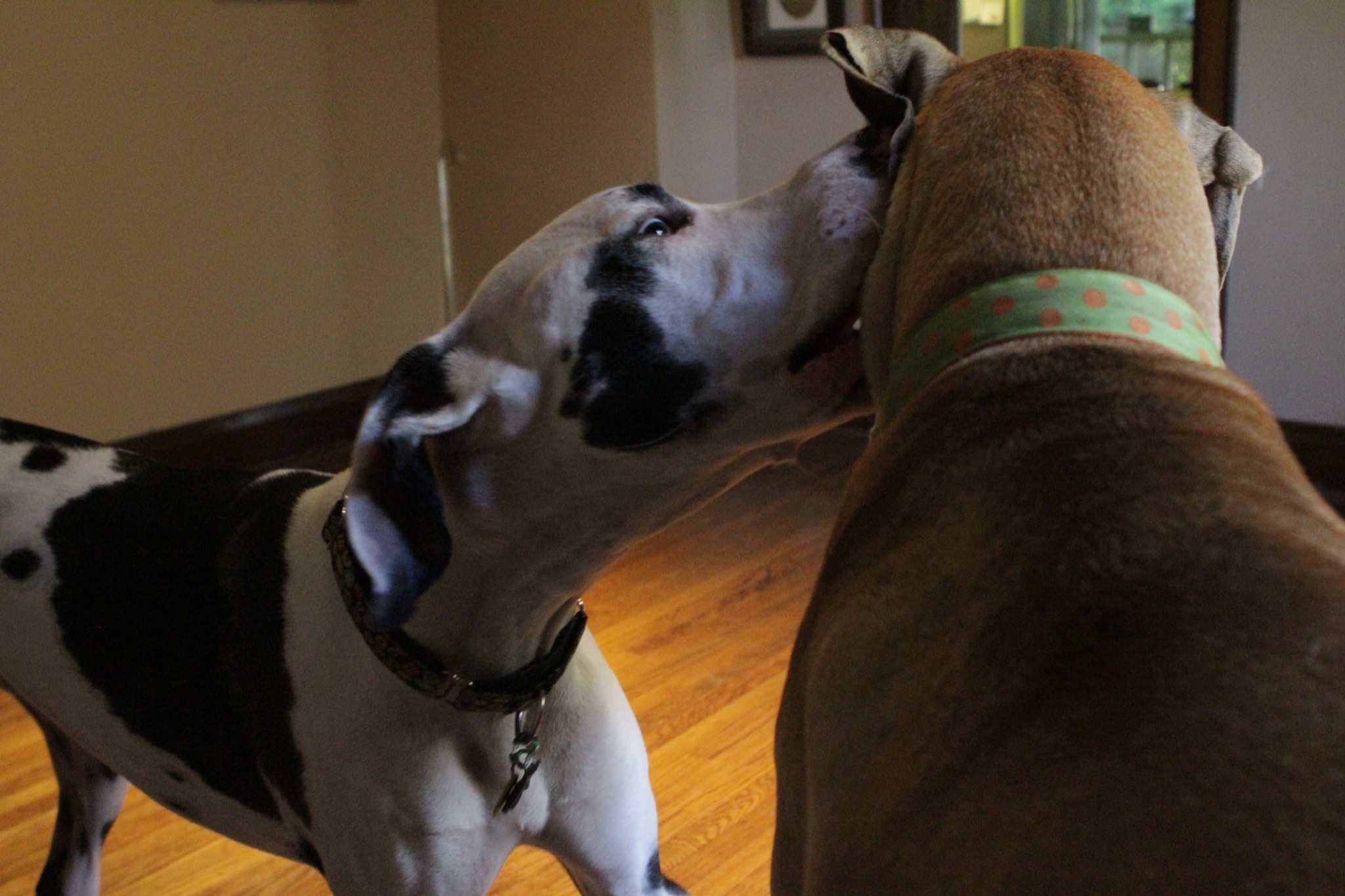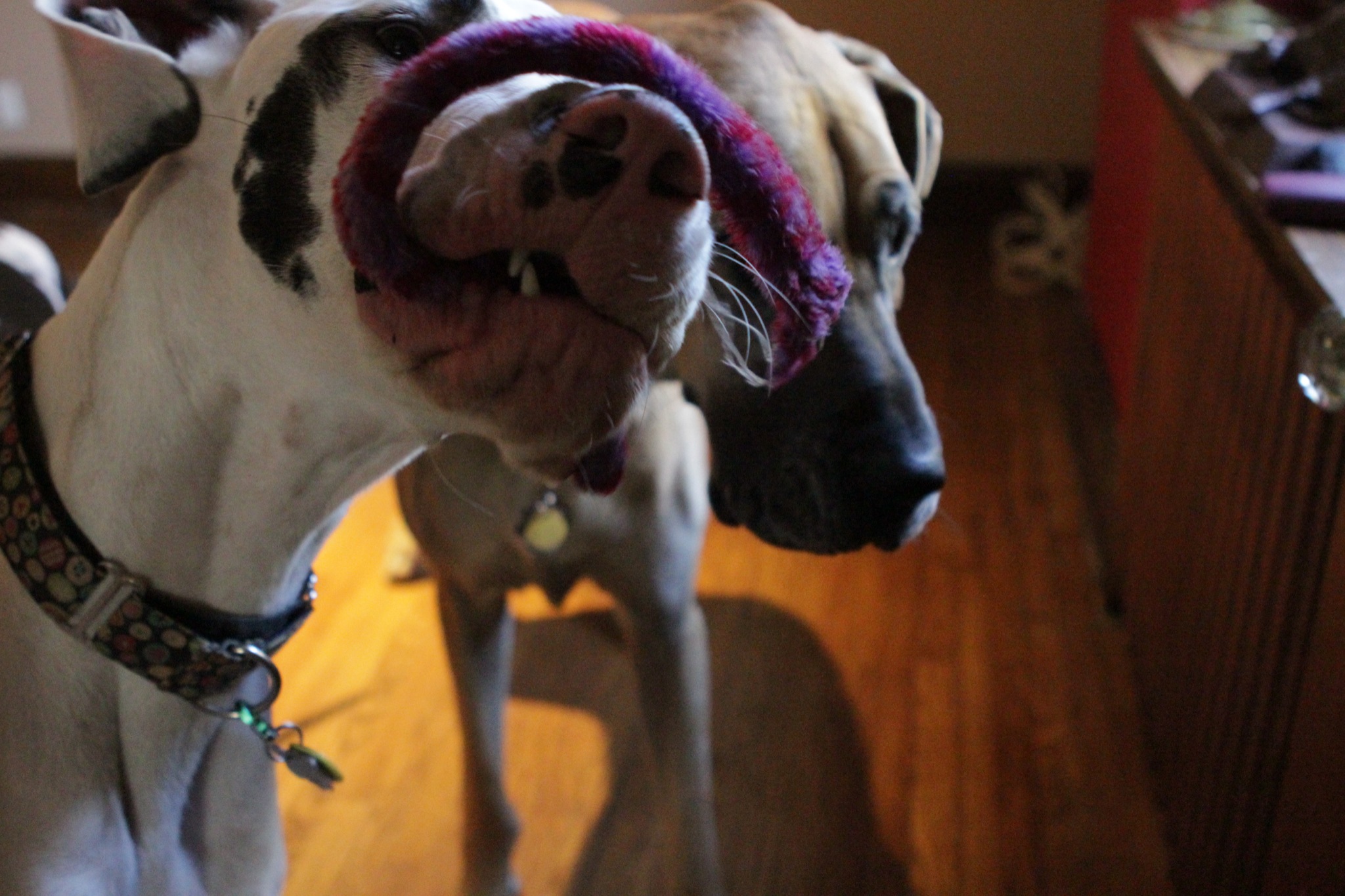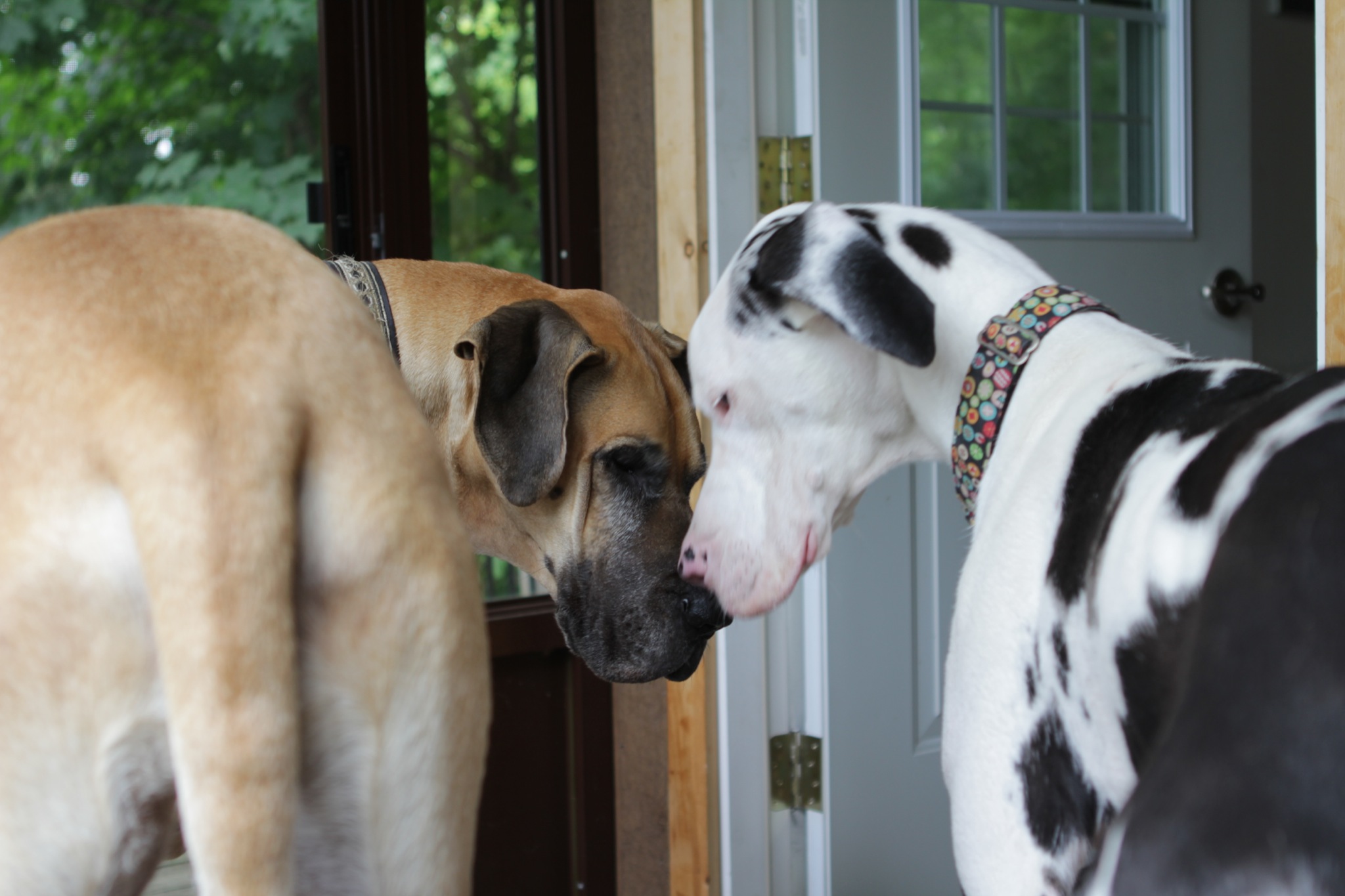 Polka. We were first told about Polka on Sunday March 3rd, 2013. A friend of ours who knows that we are very involved in Toronto's Great Dane community, as well as with Great Dane Rescue, told us that Toronto Animal Services was going to have a young Great Dane made available the next day. He was letting Sarah & I know, in case we knew of anyone that was actively looking at adopting a young Dane. I showed Sarah a picture of him, and she told me that she loved him. Well, we took Danforth down to meet the unnamed Dane the next day, and saw that the two got along. That pretty much sealed it. Sarah filled out forms to "reserve" him, and although we had other things to do that day, we quickly arranged to get our crate back, as it was on loan to another Dane household. The next day, March 5th, Sarah went with our Dane friend, Stacie, and they picked Polka up, and brought him home. We had tried to decide on the name, and it was essentially my turn, but I gave Sarah a couple of choices. She ended up intially registering him as "Panda", but couldn't stick to that, she preferred my first choice, "Polka". I was very happy with the name.