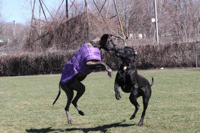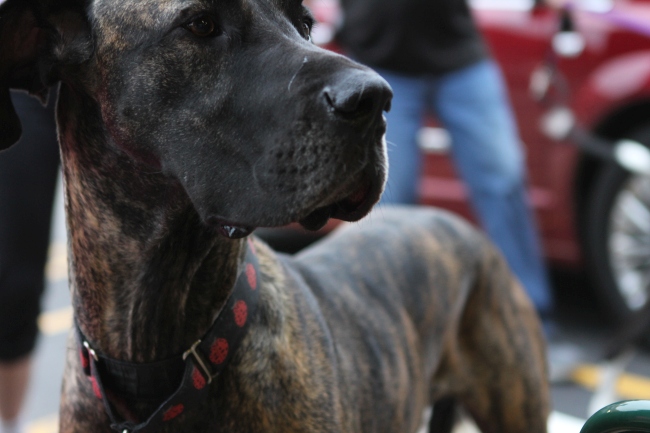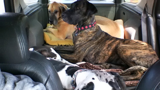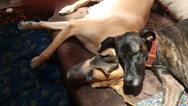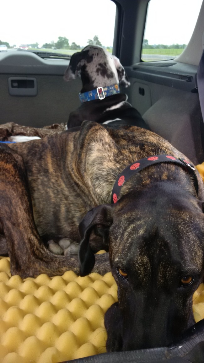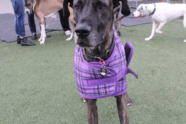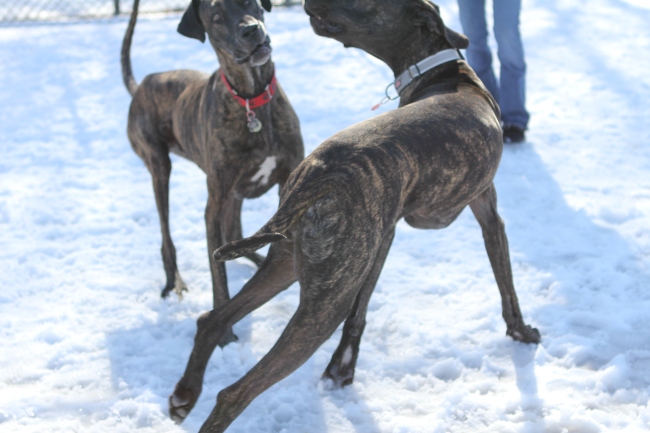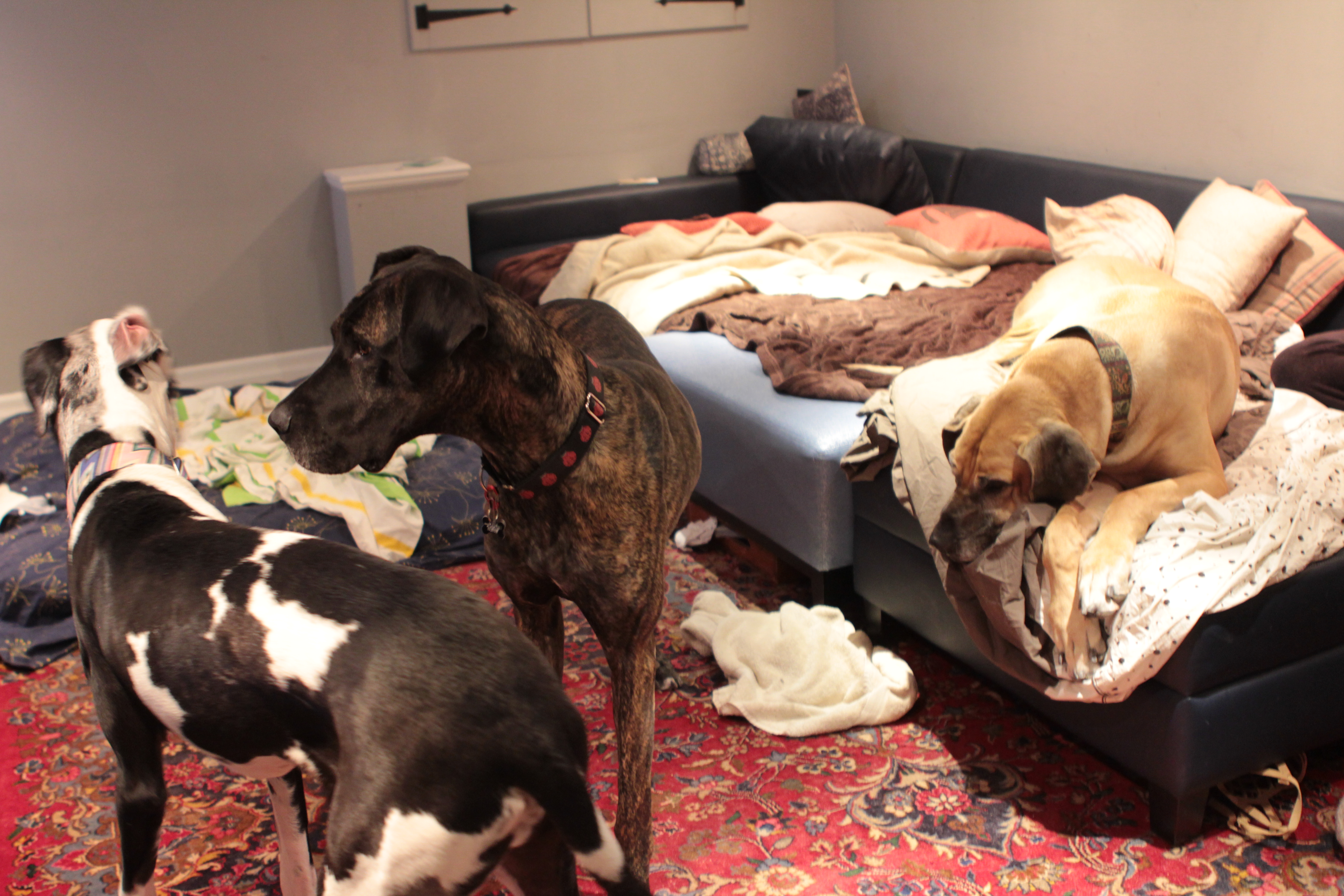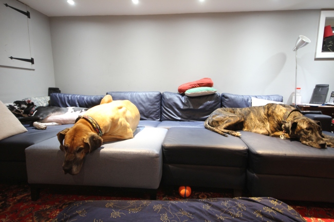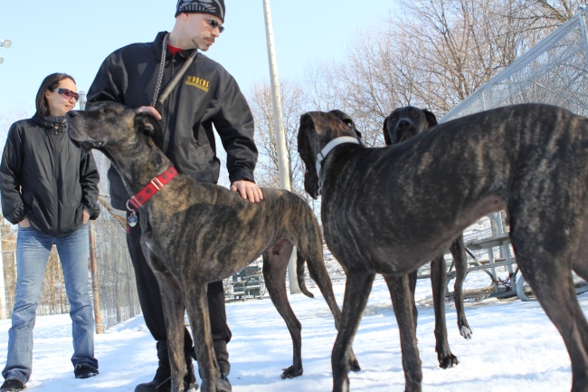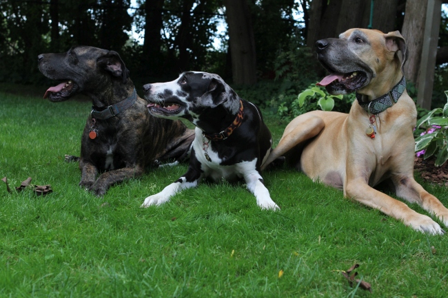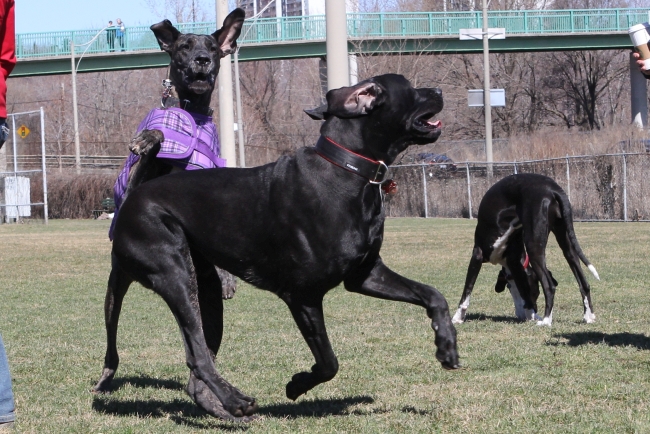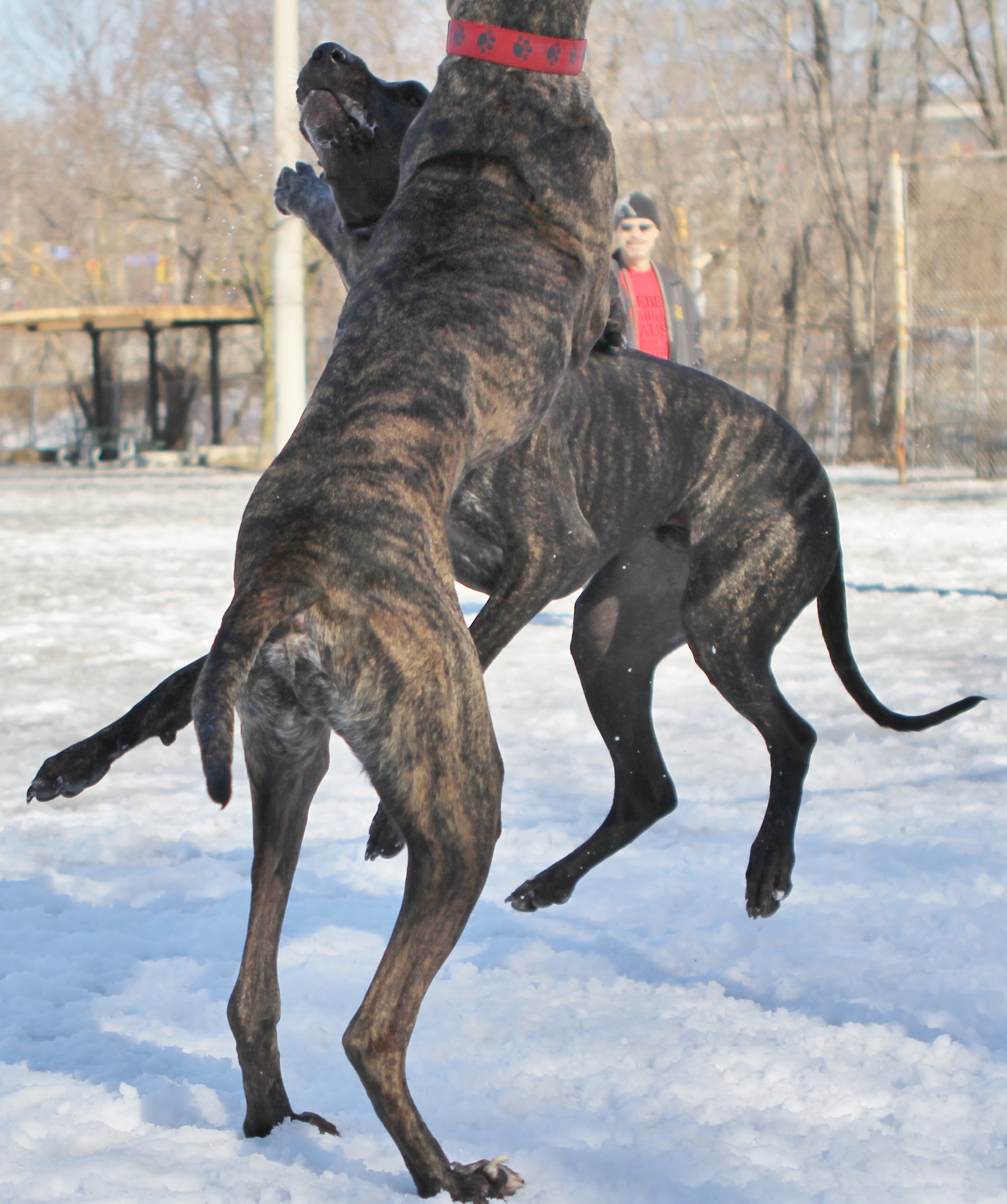 Guinness. We first heard about Guinness through GDRI due to an absolute travesty of a household. Guinness was one of four Great Danes living in a home with an abusive husband, a wife, and several children. The dogs were beaten, abused and starved. After the husband left, the family abandoned the Great Danes in the basement because they were upside-down on the mortgage. When a friend of the wife learned about this a month after the abandonment, she immediately went to house, broke in to rescue the 4, took them home and called GDRI for help. After time in the vet’s ICU, the four Danes (aged 1.5 and 3) went to four separate fosters, with Guinness going to Ontario.