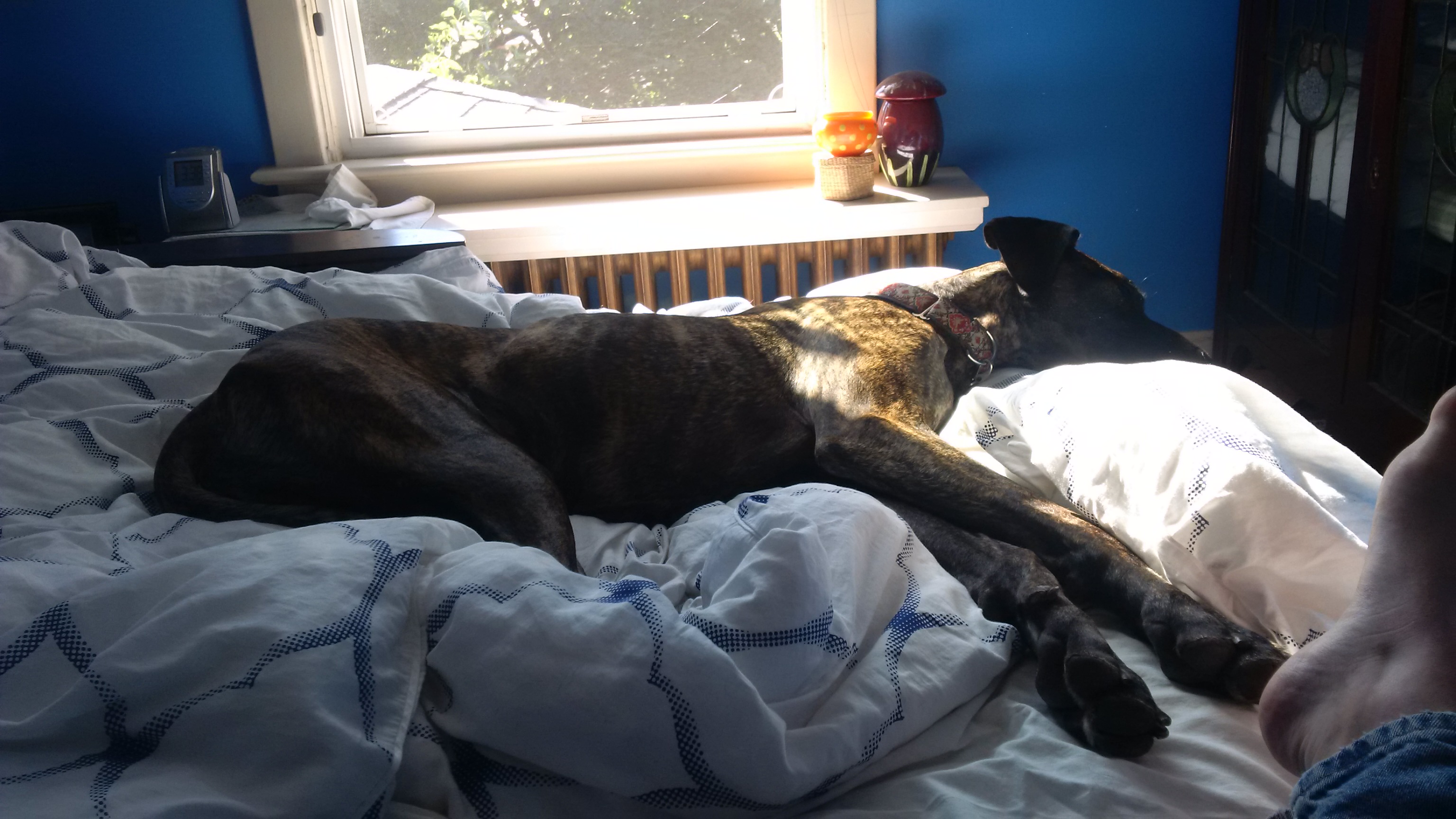 But no. The next morning, Guinness was lying on the futon in the basement, and could not move his legs. He was just rigid. We got him upstairs on a blanket, and got him outside on a bed. We could see that he had taken his last walk. We said goodbye to Guinness on a sunny afternoon on June 12, 2022.