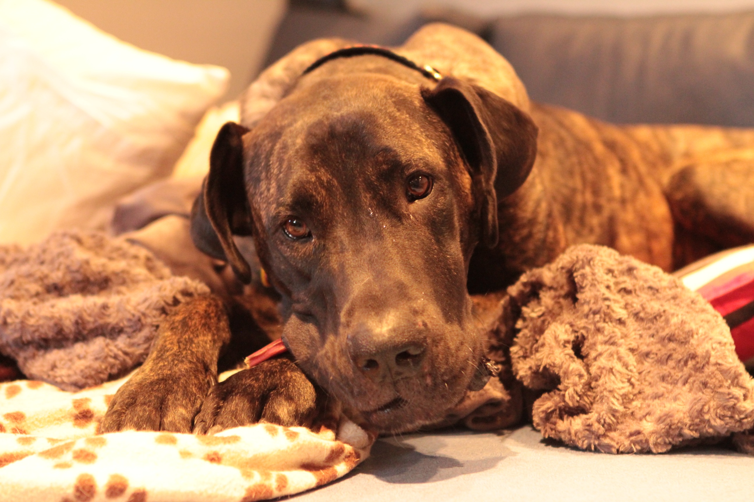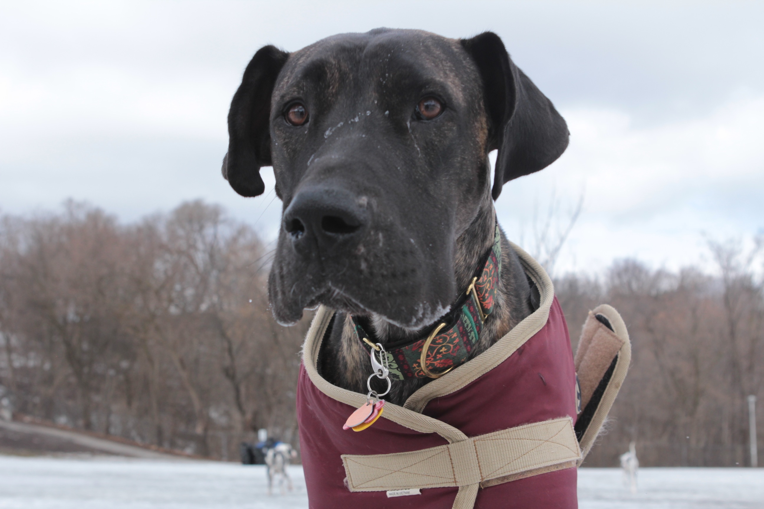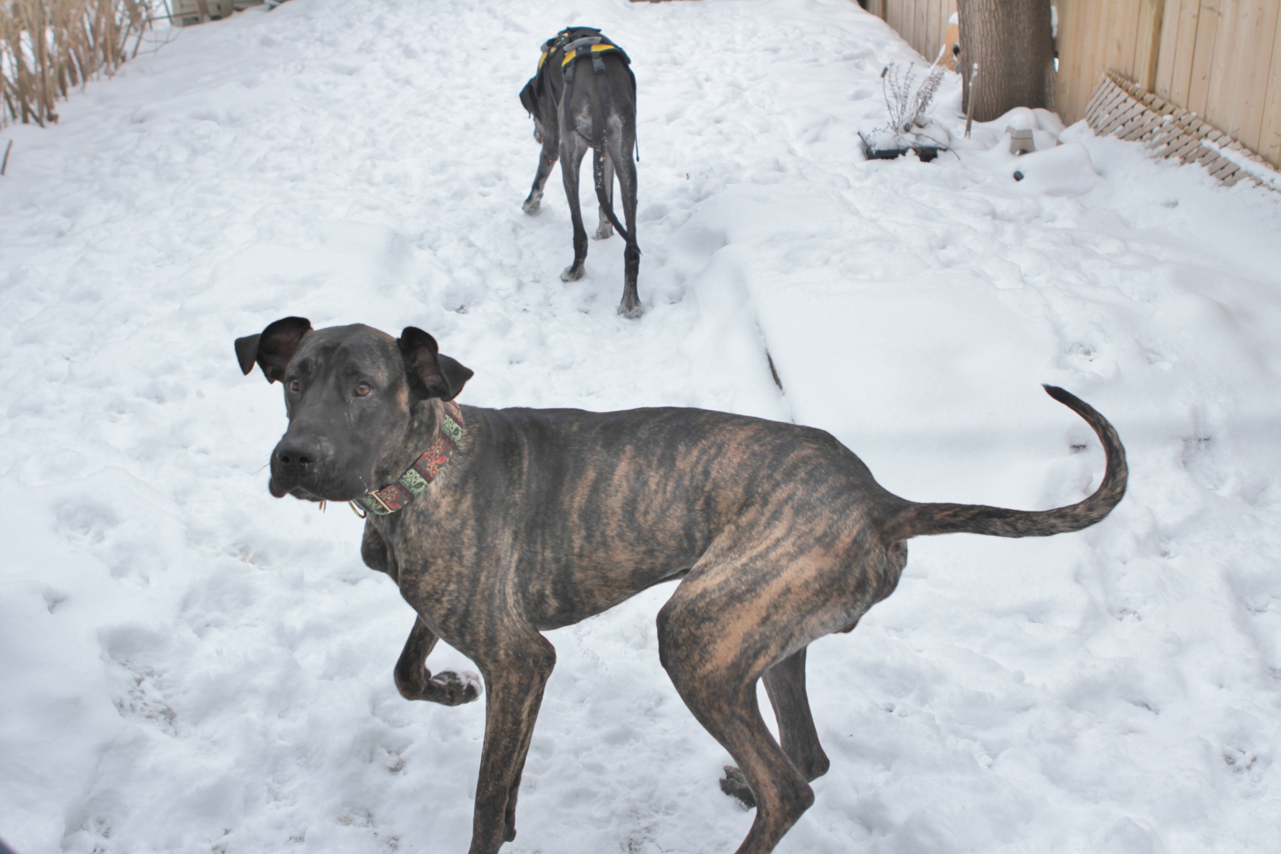 I'm a little confused about what to write. He's a shy dog, still nervous about meeting strangers, still barking at men who come into the house, as opposed to looking for affection, like Kitty and Danforth. He eats his meals very quickly, which we assume stems from his history of being starved. We believe that he would have been much bigger, based on the size of his paws, had he not been stunted by starvation. He's a striking colour, and once he does acclimatize to a stranger, he's difficult to separate from. Even my sister, who is not a fan of dogs, wanted to find a way to comfort him when we took him for a ride on the subway. He just sucks you in with his neediness. Which you have to consciously make sure not to feed too much.